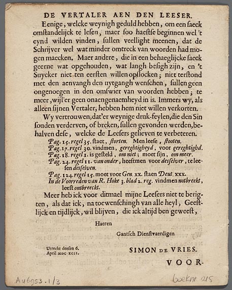 Den vertaaler aen den leeser