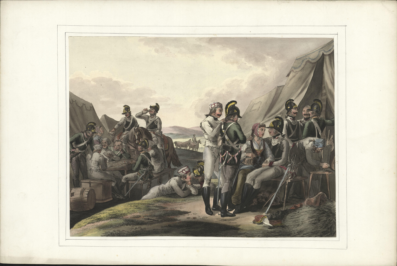 Soldaten ontspannen zich met kaartspel en vrouwelijk bezoek.