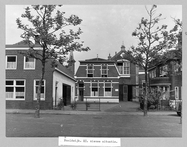 Het gebouw in het midden is een kantoor van Van den Bosch. Het gebouw daar rechtsachter is in 1900 gebouwd als groente- en fruitveiling voor Naaldwijk. Later werd dit een brandweergarage. Linksachter is de toren van de Sint Adrianuskerk aan de Molenstraat.