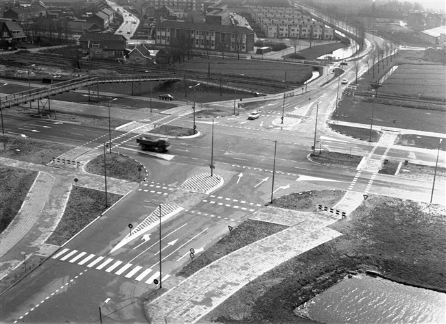 Kruising Groene Kruisweg/provinciale weg nr. 32 met de Winston Churchillaan in Spijkenisse. Links een voetgangersbrug.