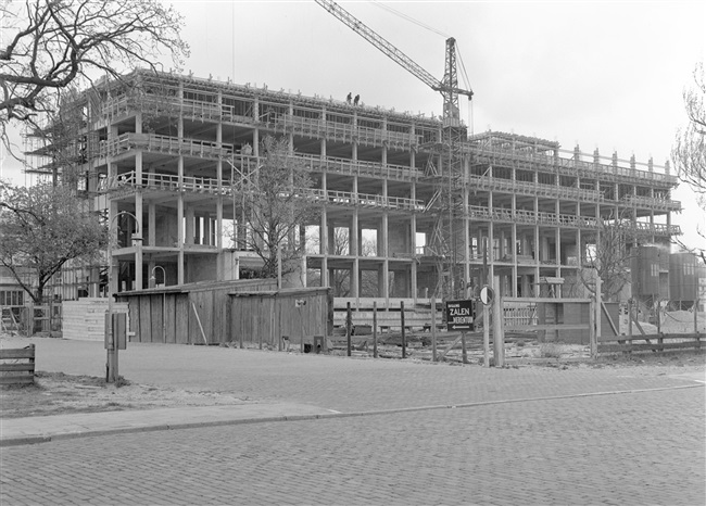Het betonskelet van de hoogbouw van het provinciehuis, gezien vanaf de Koningskade.