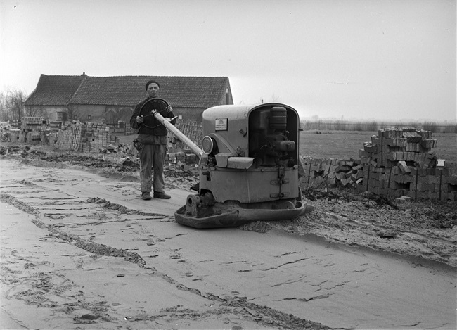 Aanleg van de (drijvende) weg nr. 29 tussen Gouda, Stolwijk en Bergstoepseveer. Een man verdicht het zand en maakt het vlak met een handgevoerde trilwals.