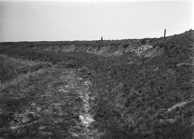 De beschadigde Zegenpoldersedijk is met zandzakken verstevigd, na een storm op 23 december 1954.
