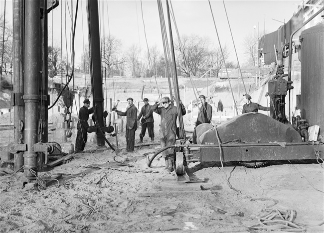 Het slaan van de heipalen voor de fundering van het nieuwe provinciehuis aan de Koningskade.