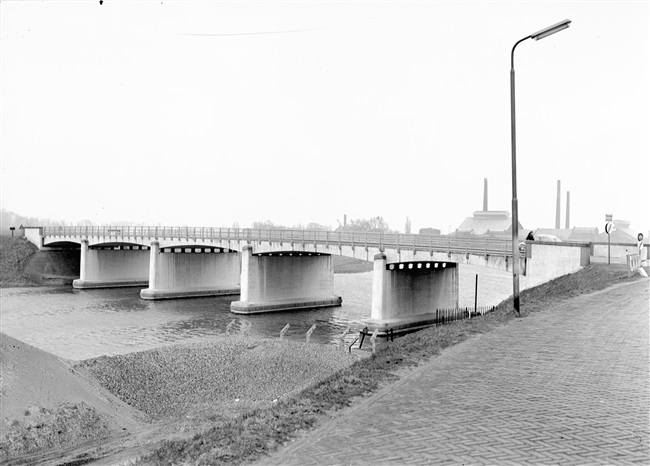 De Lingebrug over de Linge bij Leerdam. Op de achtergrond de schoorstenen van de Glasfabriek Leerdam.