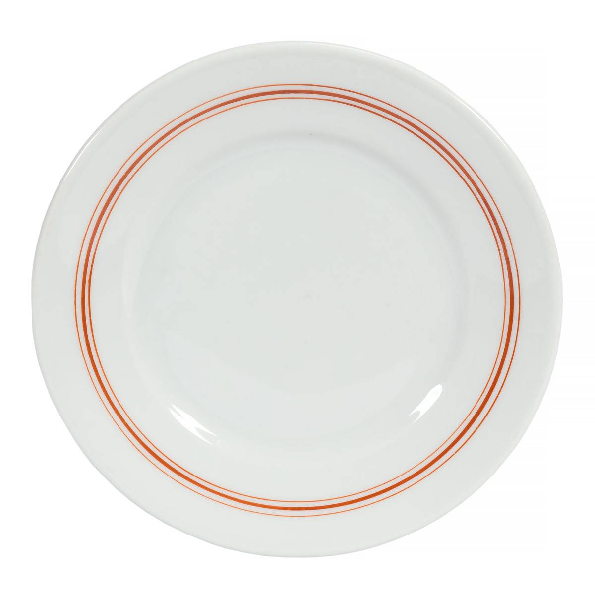 Porseleinen bord gebruikt door de Duitse Kriegsmarine. Het bord is wit van kleur en voorzien van een eenvoudige decoratie met twee oranje lijnen langs de rand. Op de onderzijde bevindt zich een fabrieks- en eigendomsstempel met de Duitse adelaar boven een swastika, met daaronder de letter ‘M’, het eigendomsmerk van de Kriegsmarine. Daarnaast is het ...