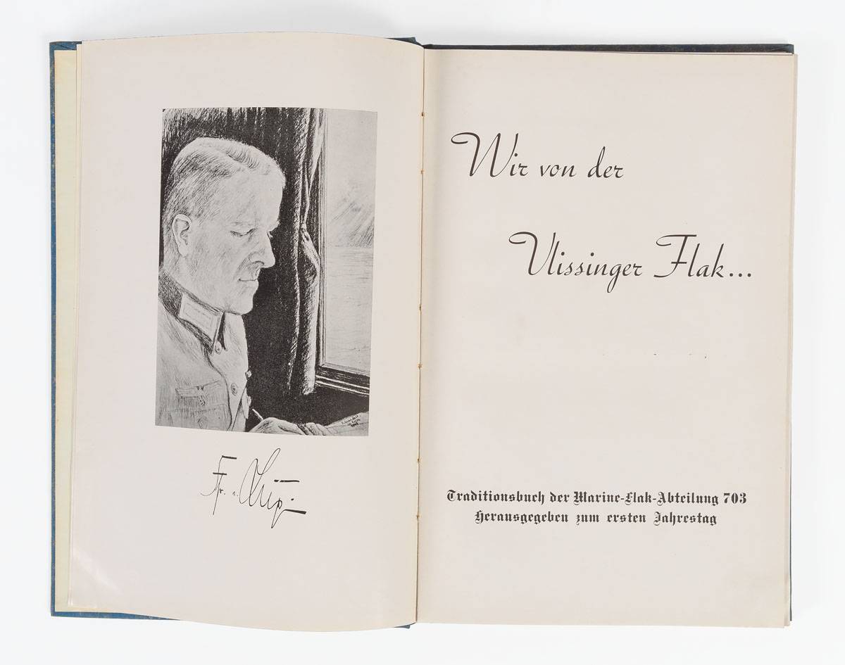Traditieboek (Erinnerungs- of Traditionsschrift) van de Marine-Flak-Abteilung 703, een luchtafweereenheid van de Duitse Kriegsmarine die tijdens de Tweede Wereldoorlog in Vlissingen was gestationeerd. Het boek werd uitgegeven in 1941 ter gelegenheid van het eerste bestaansjaar van de eenheid. In de uitgave wordt de oprichting, organisatie en inzet van de Marine-Flak-Abteilung 703 beschreven, aangevuld met foto’s ...
