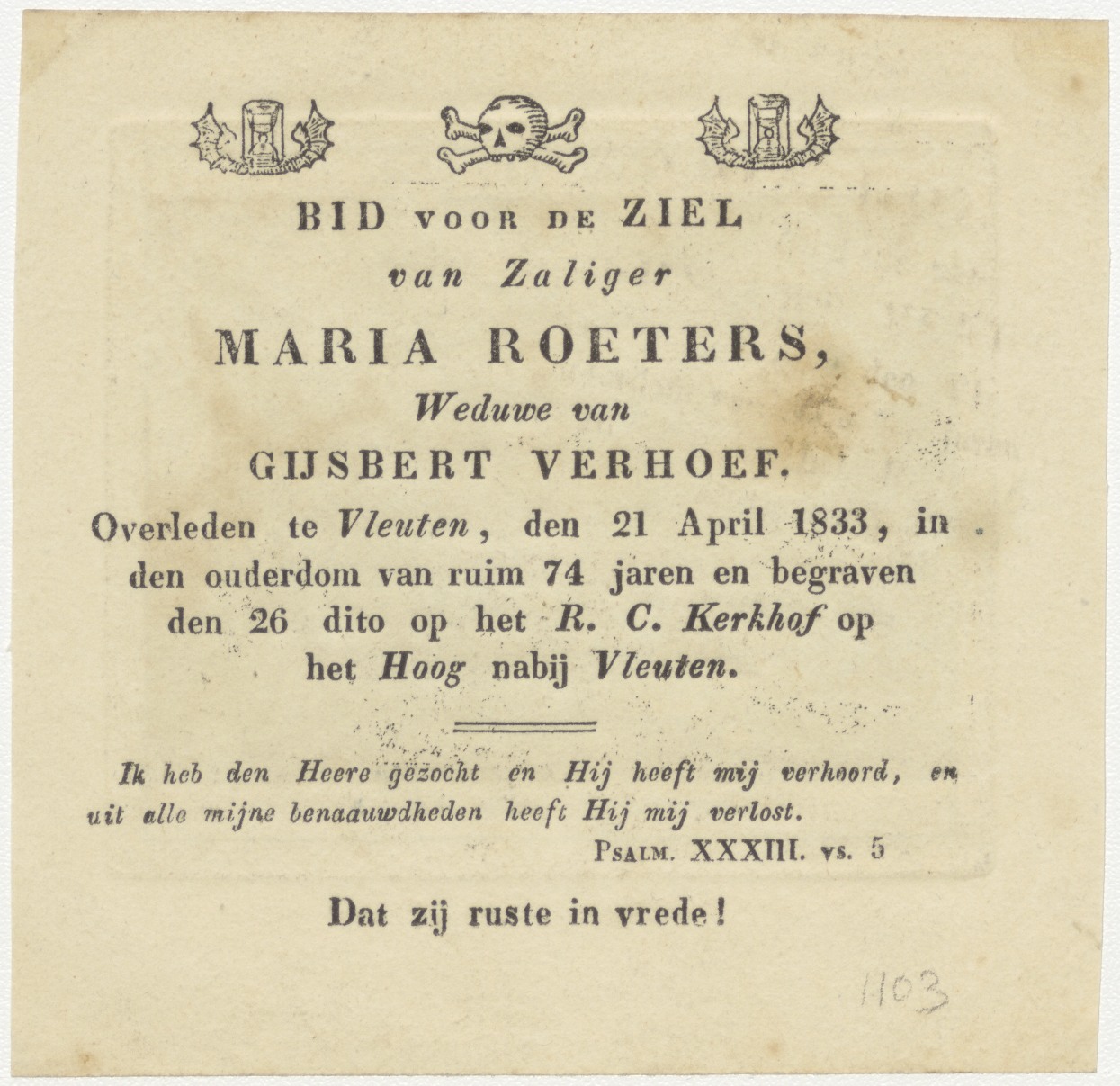 Elia vaart ten hemel, kz. Bid voor ziel Roeters (+1833);Vleuten