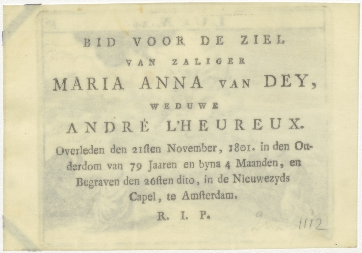 Christus verschijnt aan de Apostelen, kz. Bid voor ziel Van Dey (+1801);Nieuwe Zijdskapel;Amsterdam