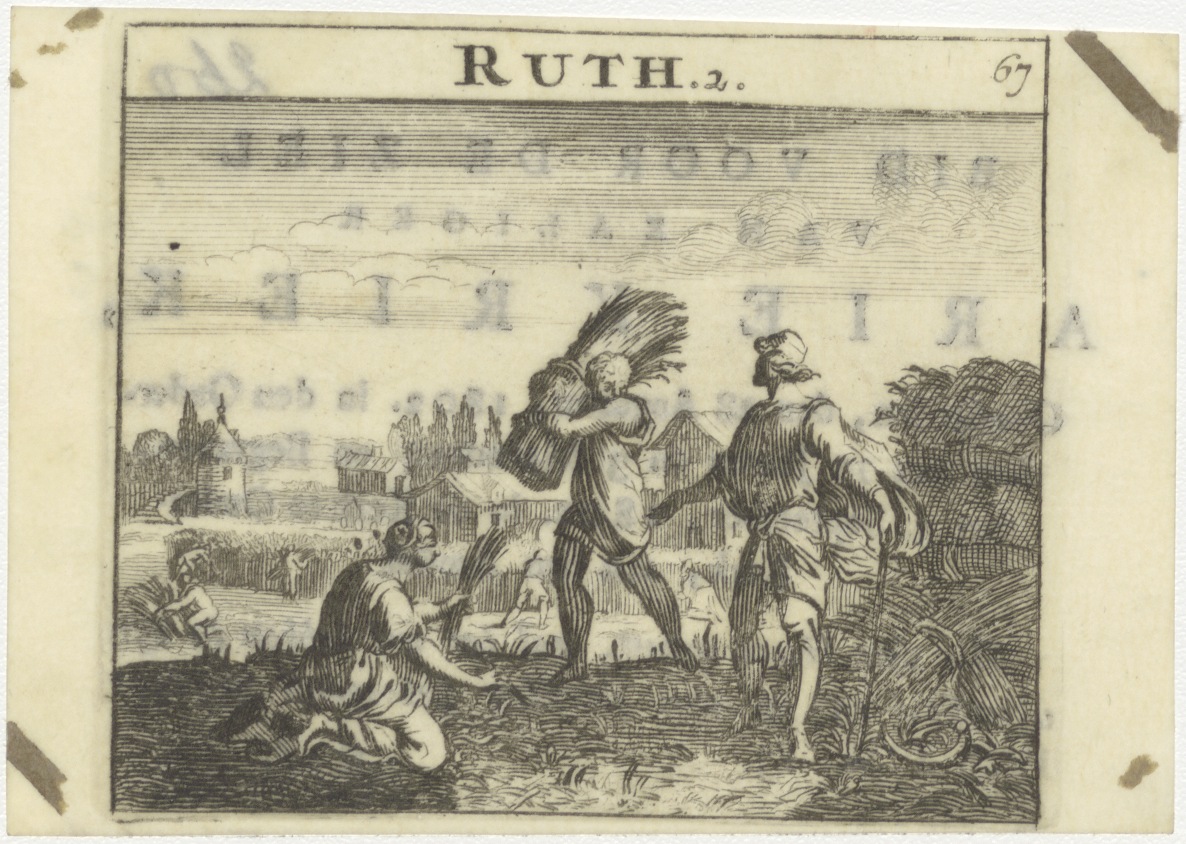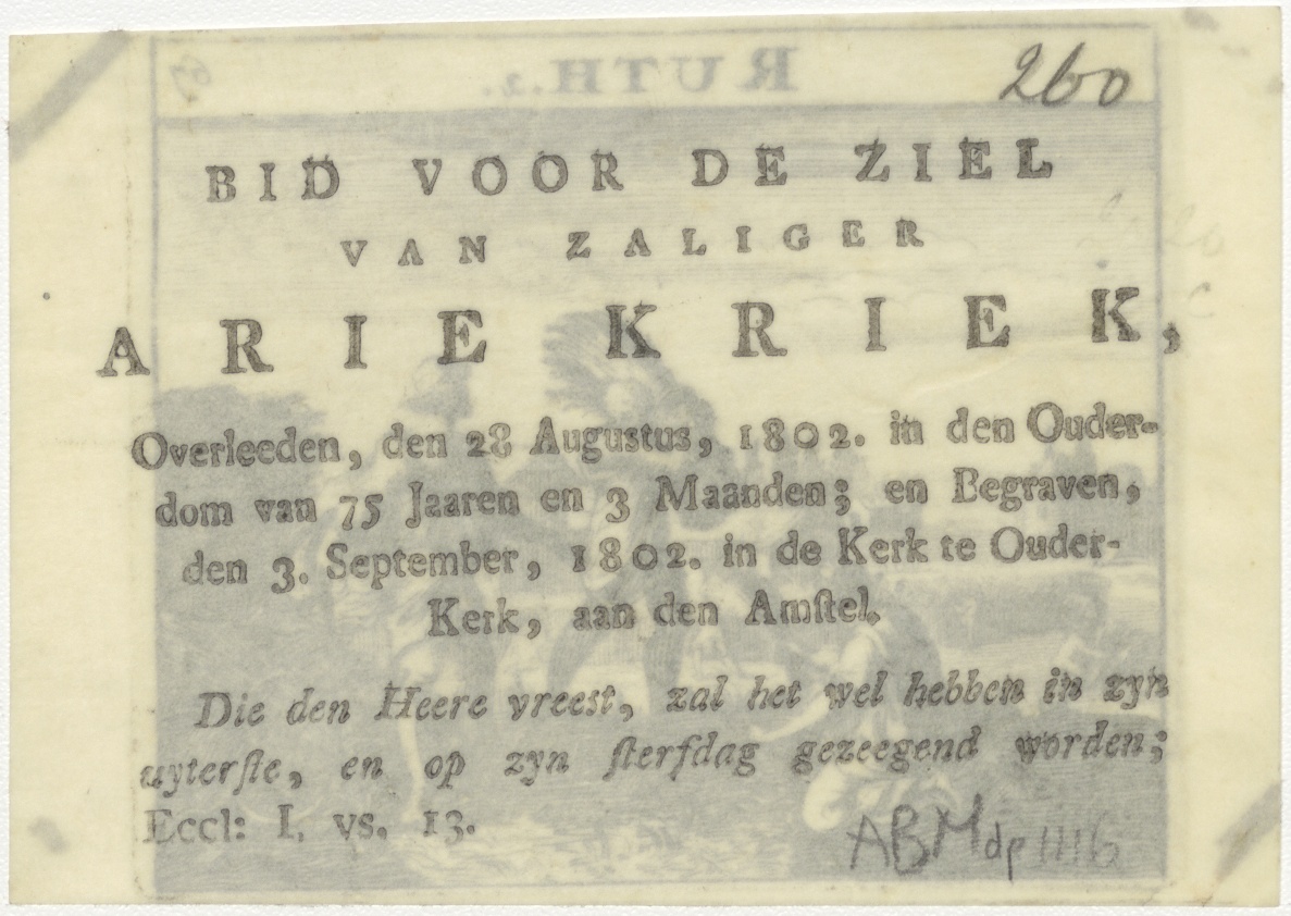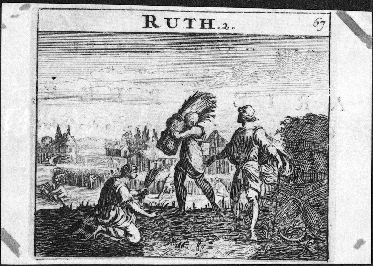Ruth, aren lezende in het veld, en Boaz, kz. Bid voor ziel Kriek (+1802);Ouderkerk a/d Amstel