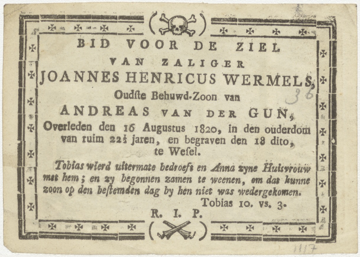 Ezau verkoopt het eerstgeboorterecht aan Jacob (Gen.25), kz. Bid voor ziel Wermels (+1820);Wesel