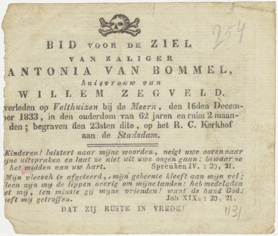 De Mannamorgen, kz. Bid voor ziel Antonia van Bommel (+1833);Velthuizen