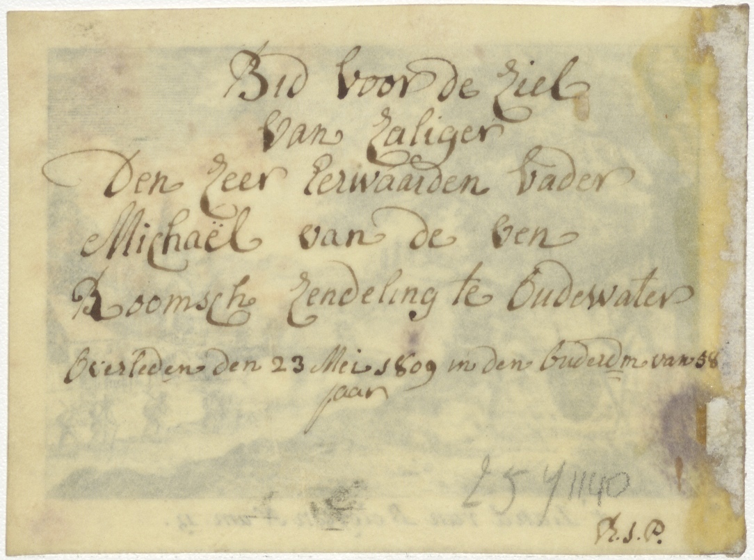 Het land van belofte (De verspieders van Kanaän), kz. Religieus;Bid voor ziel Van de Ven (+1809);Roomsch zendeling;Oudewater