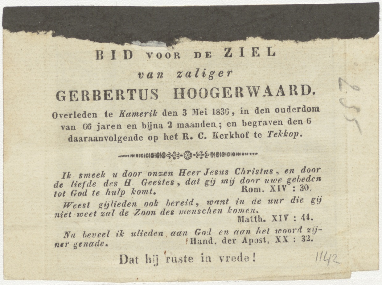 De dood van Eli, kz. Bid voor ziel Hoogerwaard (+1836);Kamerik