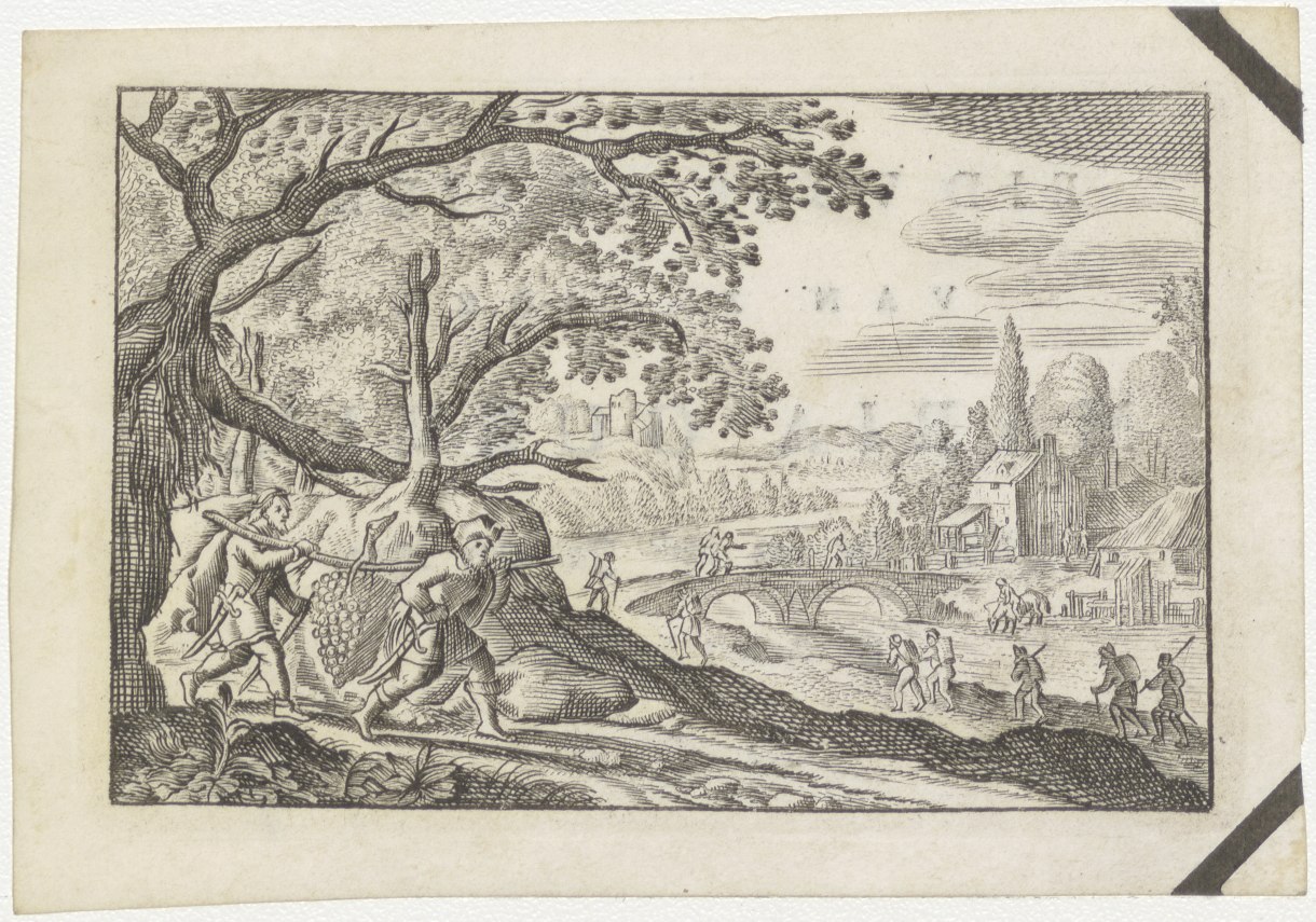 De bespieders uit het land van Kanaän terug tot Mozes en Aäron, met de grote tros druiven, kz. Bid voor ziel Guerin (+1800);Amsterdam