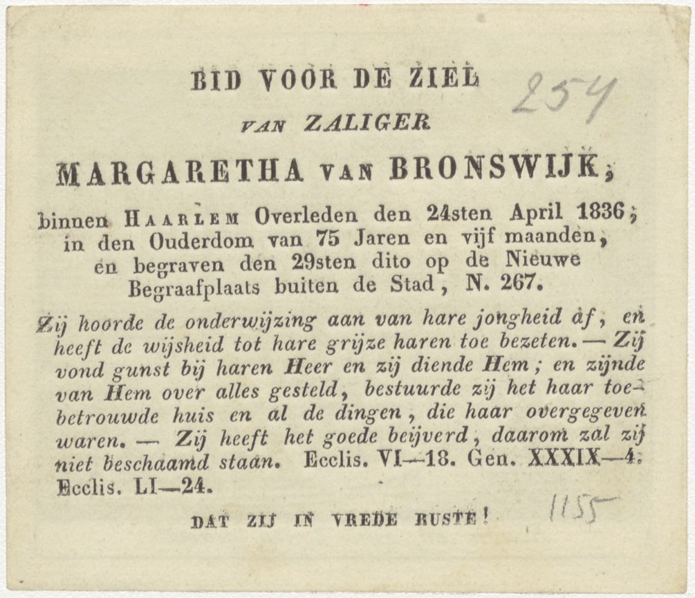 Simon en zijn zonen gedood (Machabeën), kz. Bid voor ziel Bronswijk (+1836);Haarlem