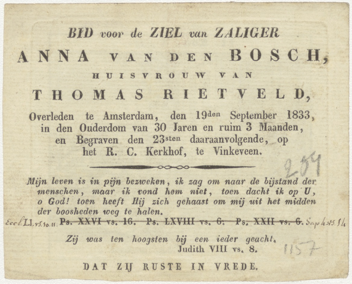 Priesters van Baäl gedood, kz. Bid voor ziel Bosch (+1833);Amsterdam