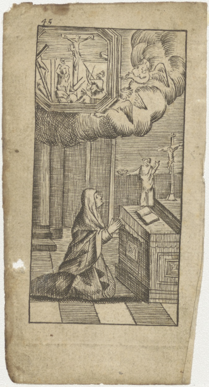 Een non, biddend voor een altaar, waarop een heiligenfiguur staat, die haar een kroon aanreikt