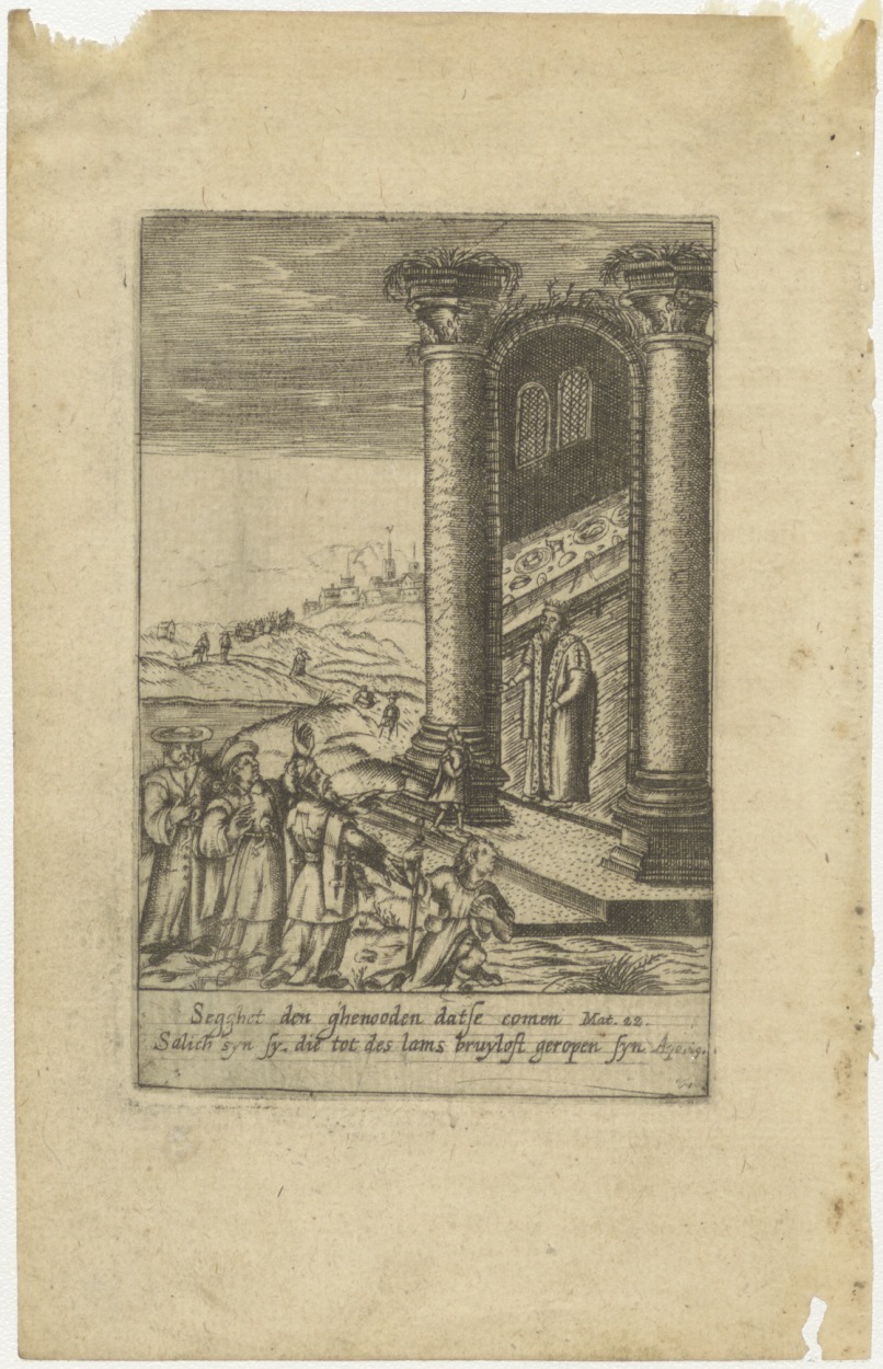 Pagina uit boek De geestelijcke vryagie, 1626: Koning nodigt bruiloftsgasten uit (Matth.22)