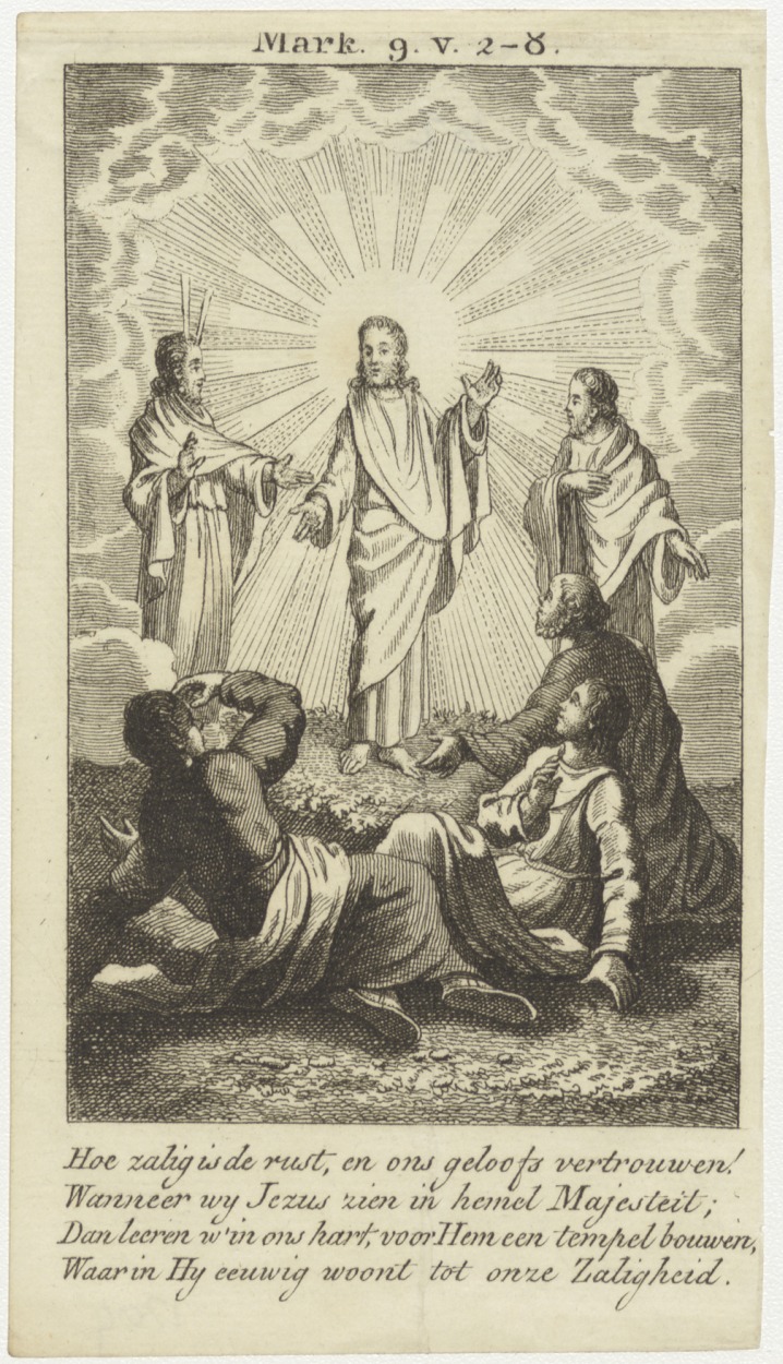 Verheerlijking op de berg Thaber, Johannes, Petrus en Jacobus zien Jezus, Mozes en Elia