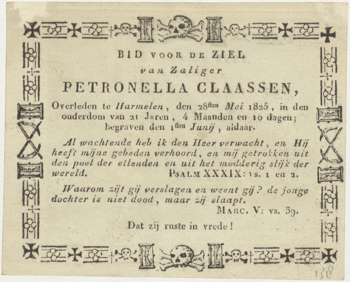 De opwekking van de zoon te Naïm, kz. Bid voor ziel Petronella Claassen (+1825);Harmelen