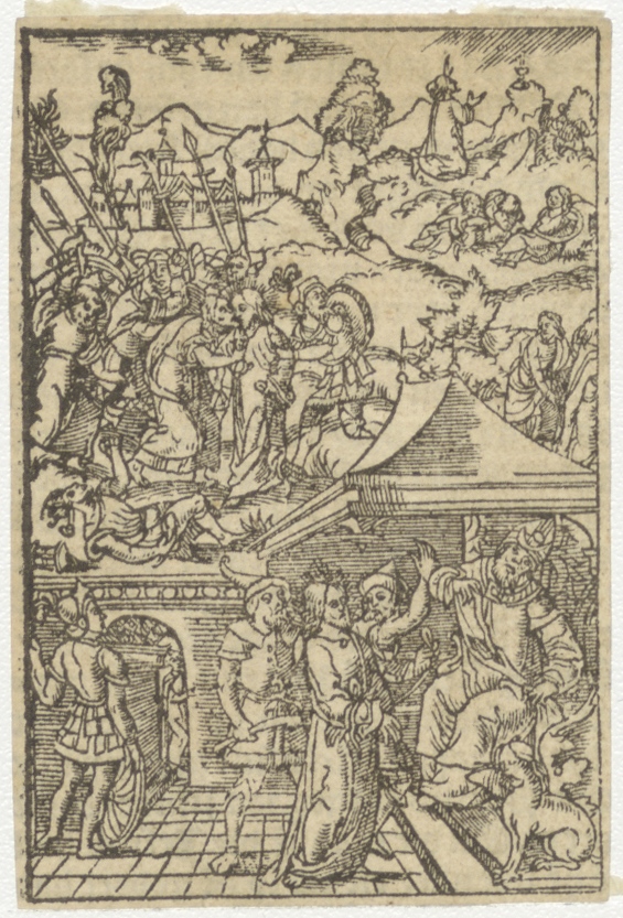 Boven: Gevangenneming van Christus onder: Christus voor Caiaphas, kz. gedrukte tekst