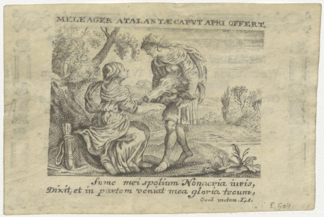 Scène uit Ovidius, Metamorphose: Meleager geeft de zwijnskop aan Atalanta, kz. Bid voor ziel Den Boer (+1806);Bokhoven