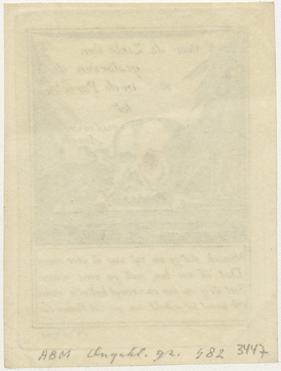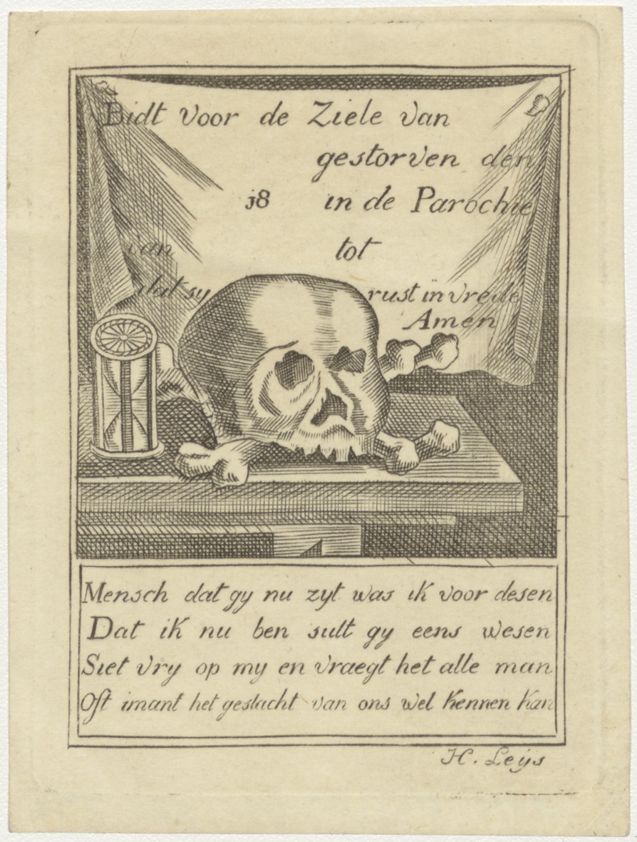 Invulbare bidprent met doodsallegorie: schedel, doodsbeenderen en zandloper, met "Bidt voor de ziele van ... gestorven den ... 18 ... in de parochie van ... tot ..."