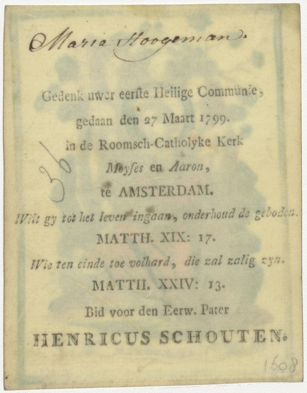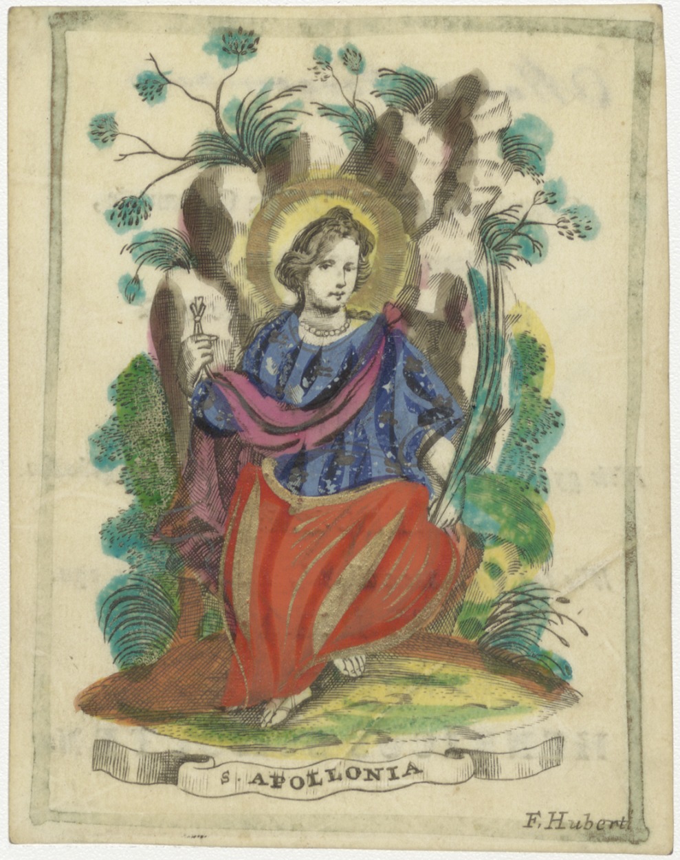 H. Apollonia, ingekleurd, kz. H. Communie Hoogeman;1799;van pastoor Henricus Schouten;Mozes en Aaronkerk;Amsterdam