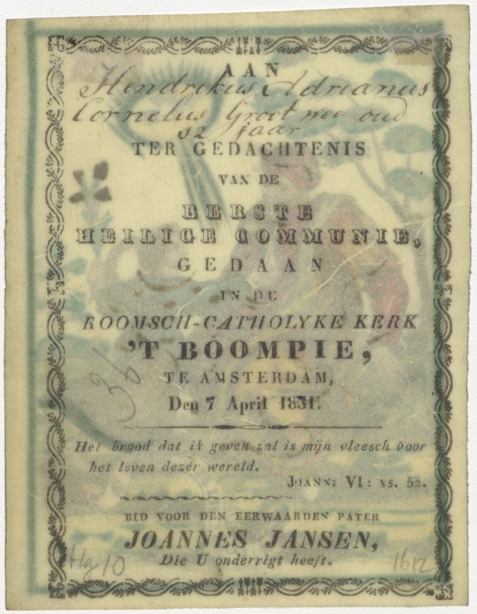 H. Joachim, ingekleurd, kz. H. Communie Groot;1831;door pastoor Joannes Jansen;'t Boompje;Amsterdam