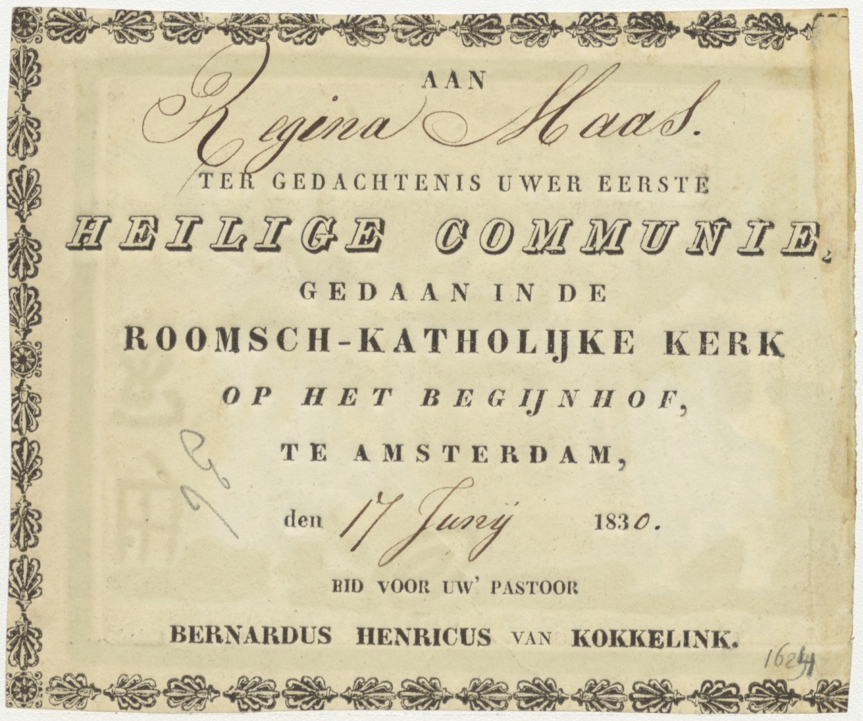 Engelen met lijdenswerktuigen, ingekleurd, kz. H. Communie Haas;1830