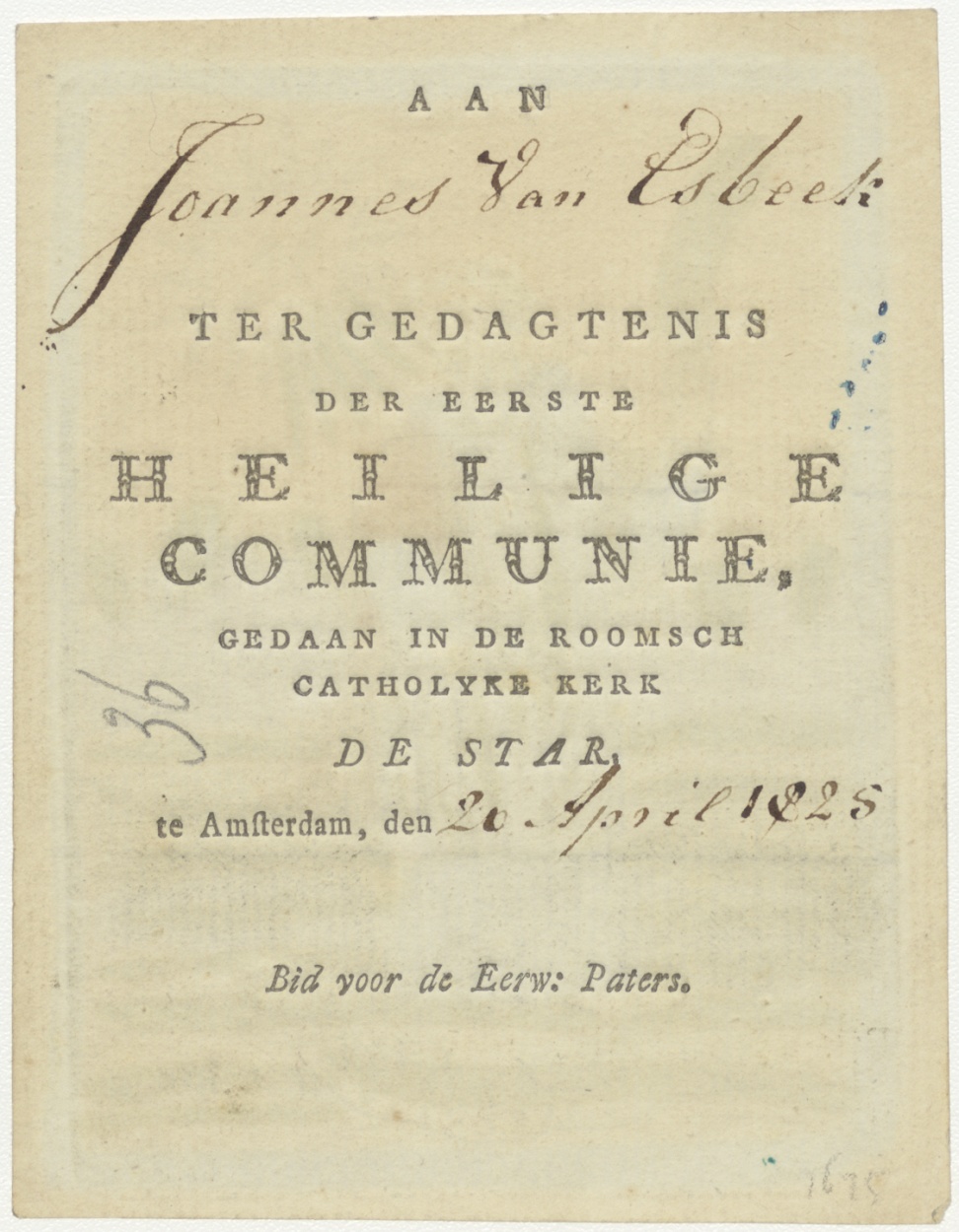 H. Laurentius, ingekleurd, kz. H. Communie Esbeek;1825;De Star;Amsterdam