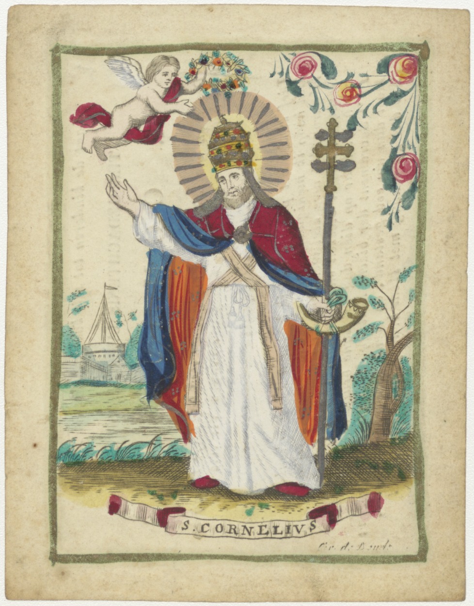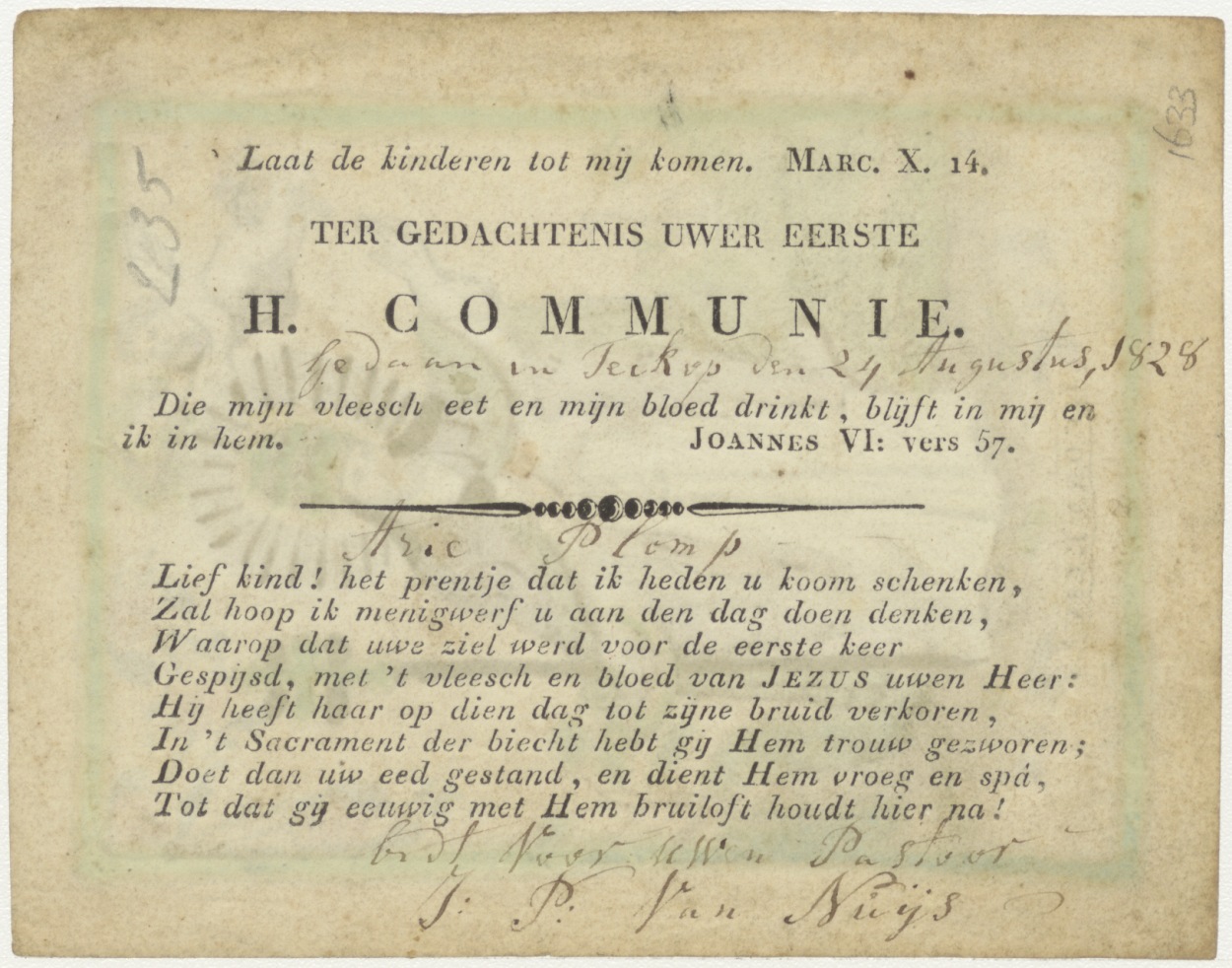 H. Cornelius, ingekleurd, kz. H. Communie Techop;1828