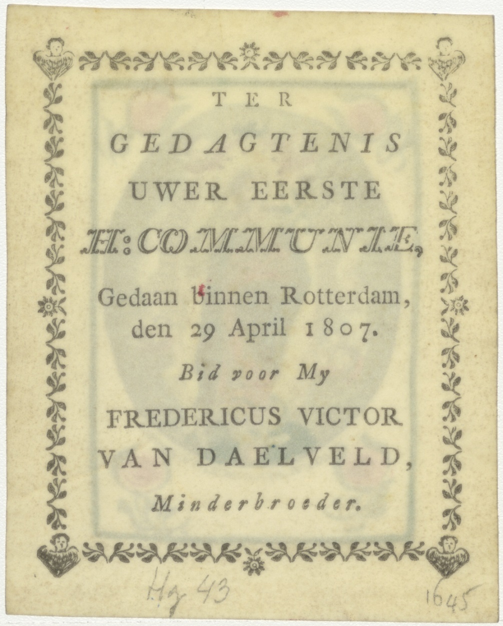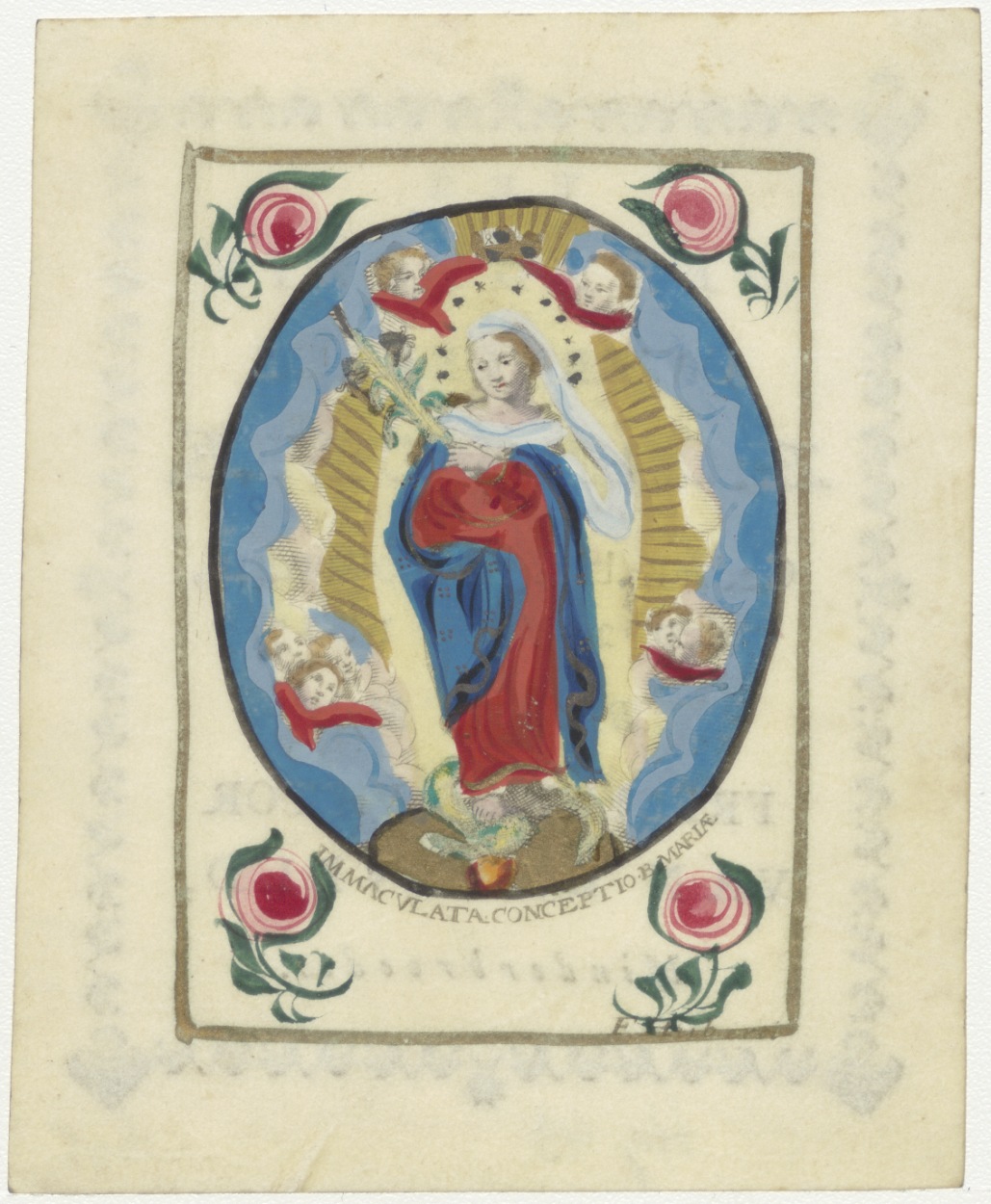 Maria, onbevlekt ontvangen, ingekleurd, kz. H. Communie door pastoor Fredericus Daelveld;Rotterdam;1807