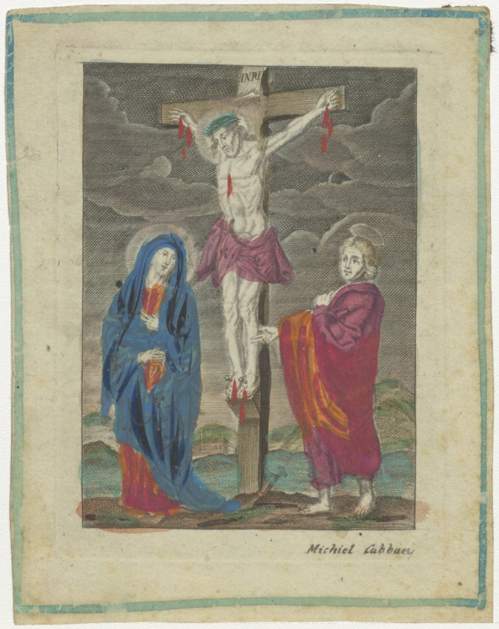 Christus aan het kruis, met Maria en Johannes, ingekleurd