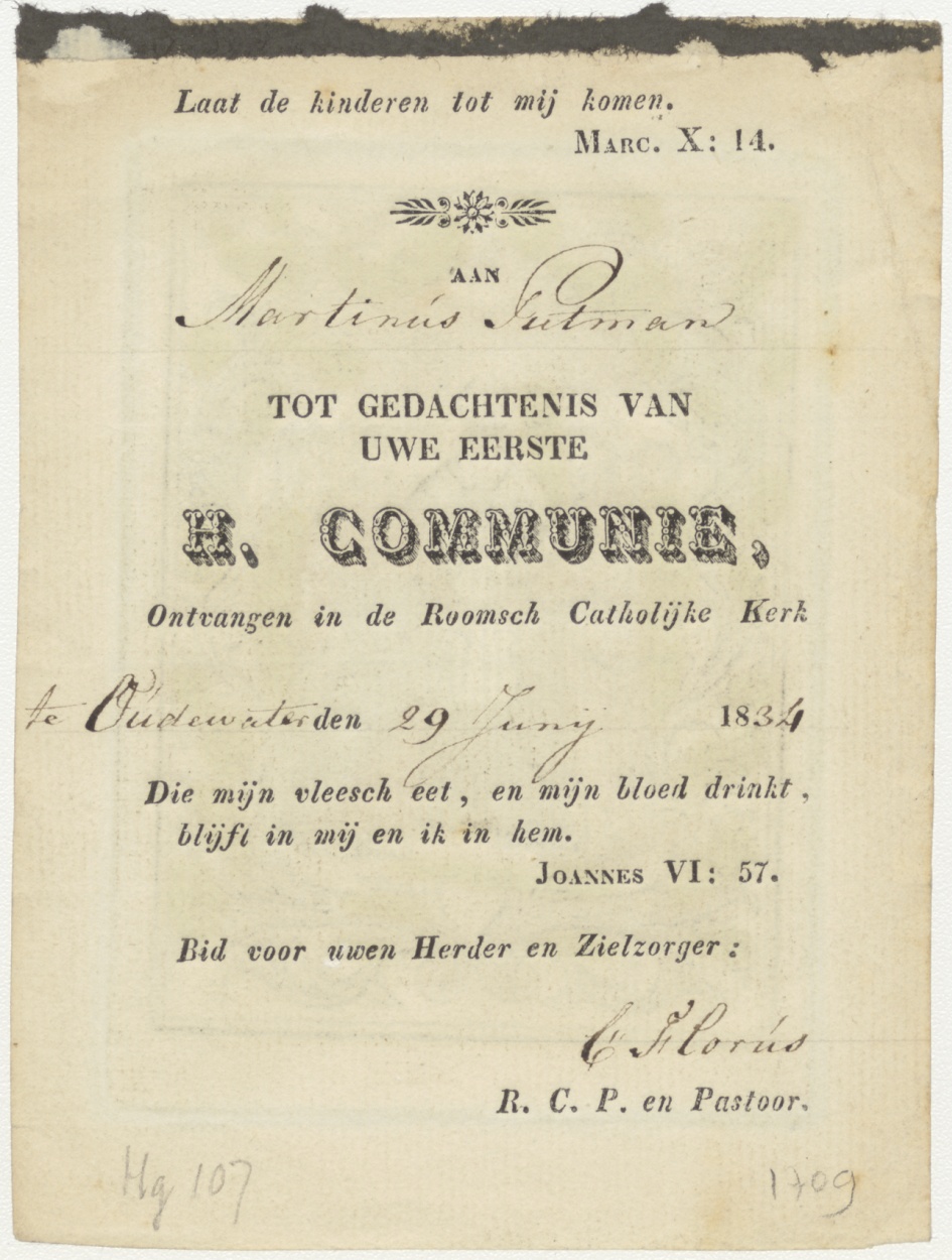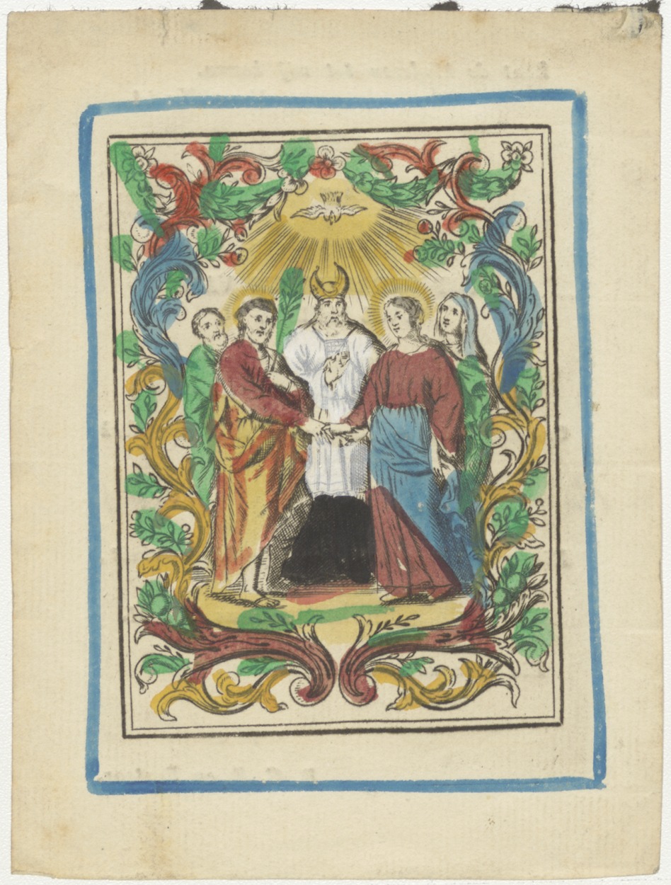 Verloving van Maria en Jozef, ingekleurd, kz. H. Communie Martinus Putman;1834;Oudewater