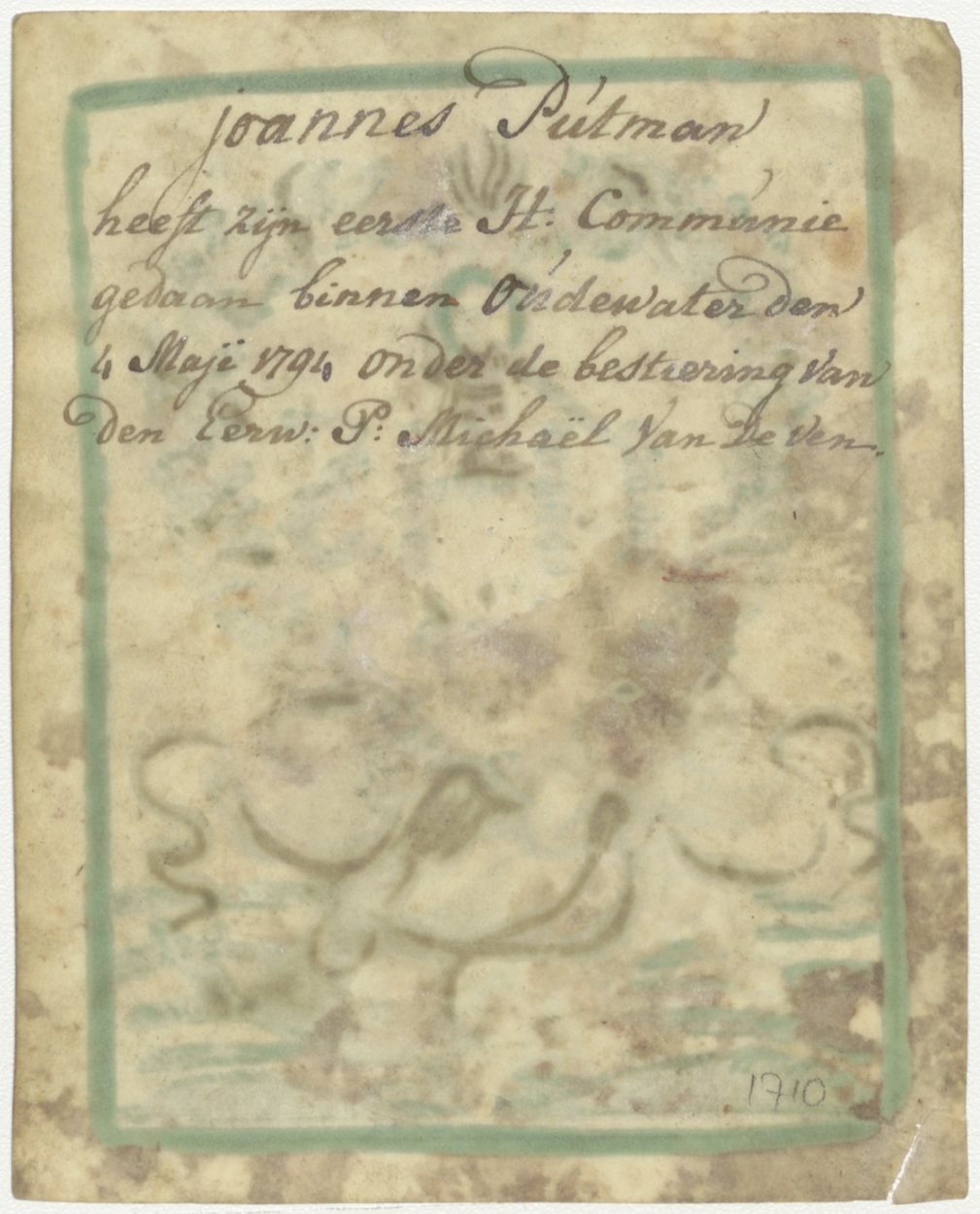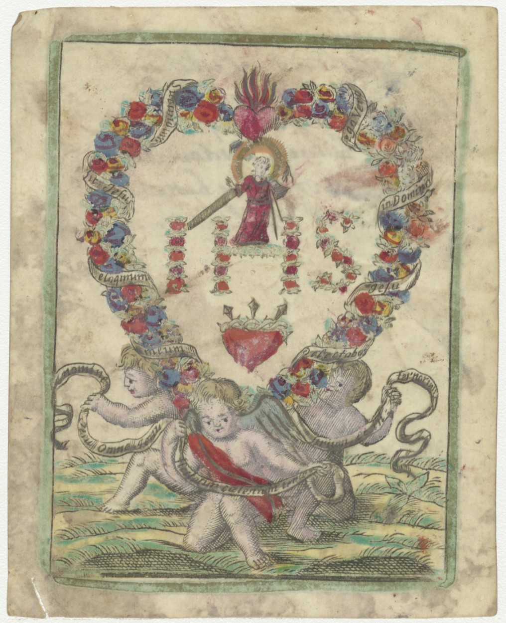 H. Hart met Christuskind boven IHS, ingekleurd, kz. H. Communie Joannes Putman;1834;Oudewater;pastoor v.d. Ven