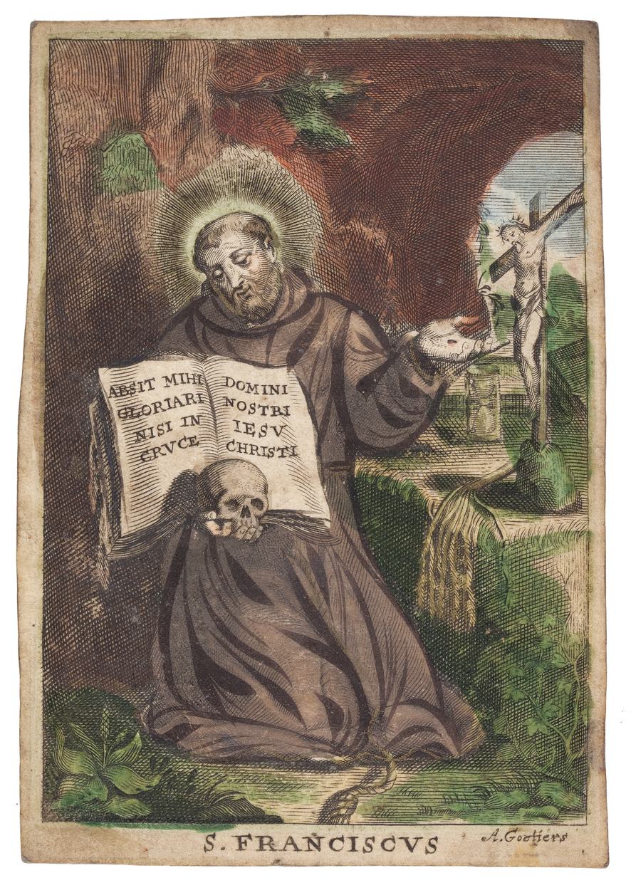 H. Franciscus, ingekleurd, met bijbelcitaat: Absit mihi gloriari nisi in cruce Domini Nostri Iesu Christi (Maar ik wil me op niets anders laten voorstaan dan het kruis van Jezus Christus. uit: Brief aan de Galaten 6:14)