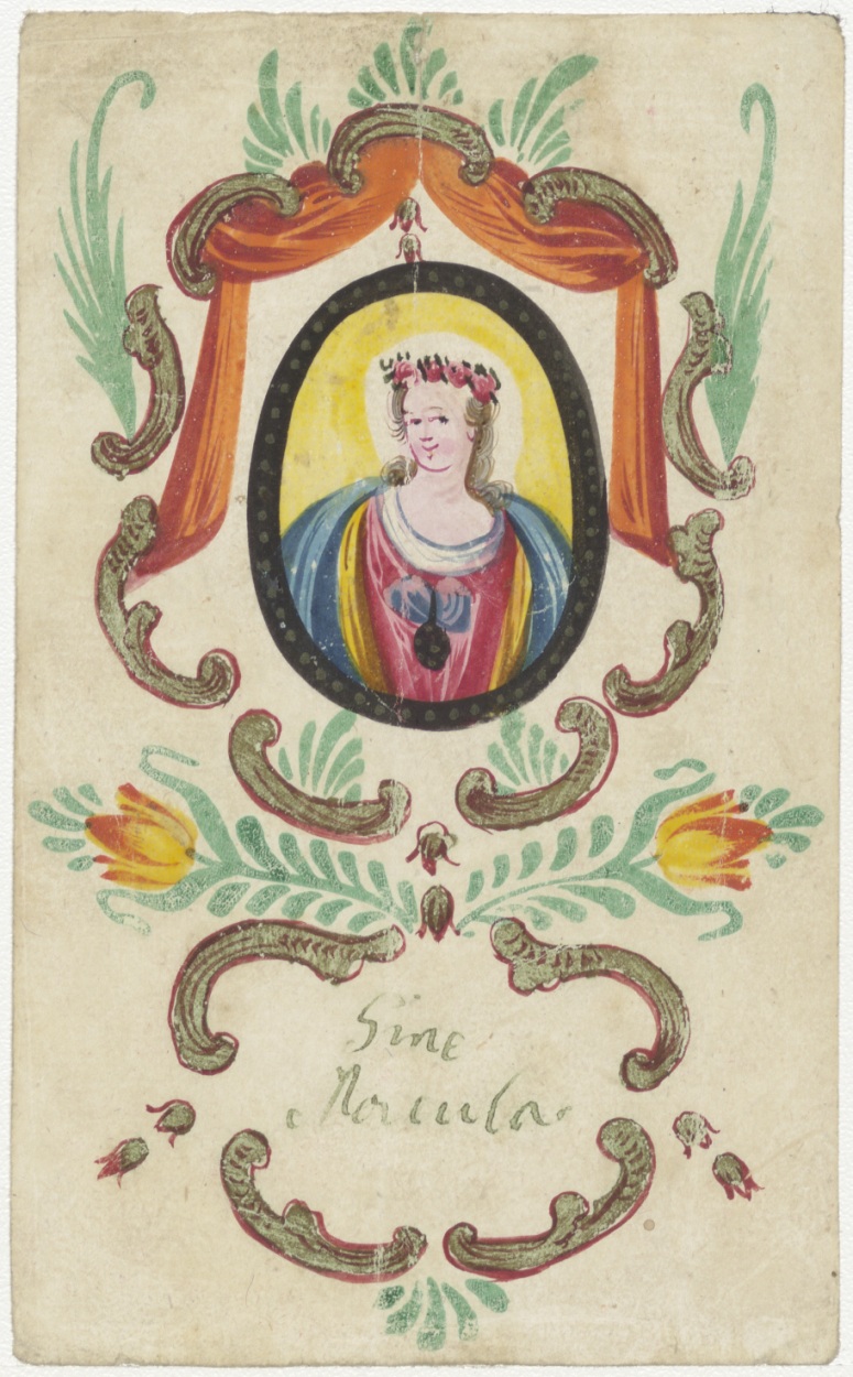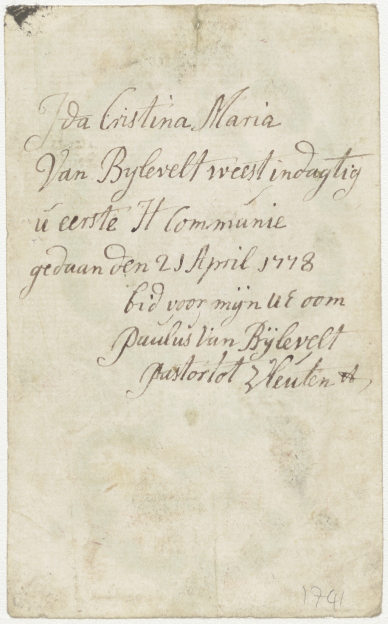 Maria, onbevlekt ontvangenis(?), ingekleurd, kz. H. Communie van Ida Cristina Maria van Bijlevelt (1778), bid voor mijne oom, pastor Paulus Bijlevelt te Vleuten