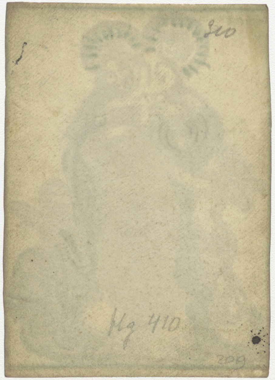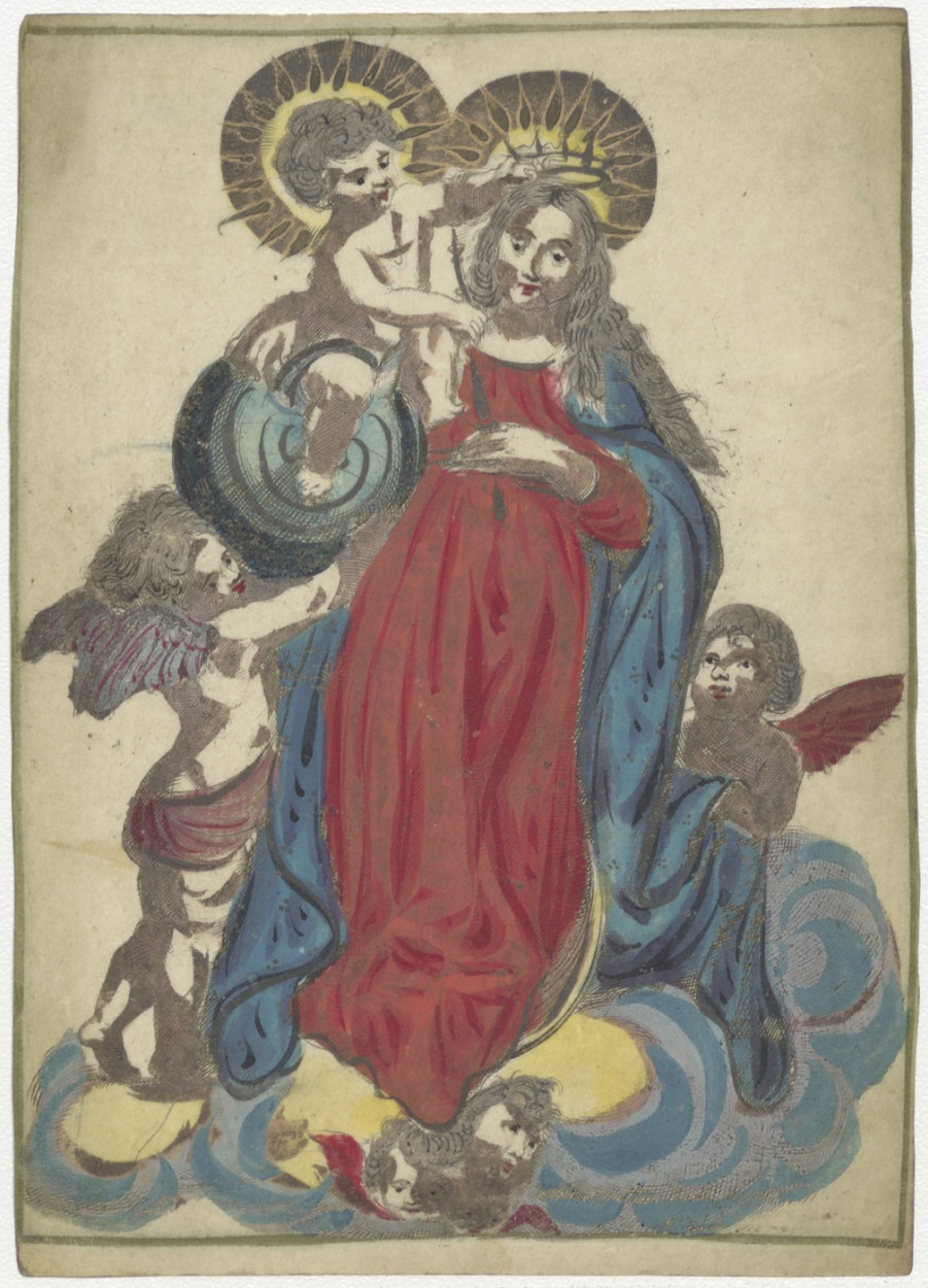 Maria staande op wolken omgeven door cherubijnen, ingekleurd