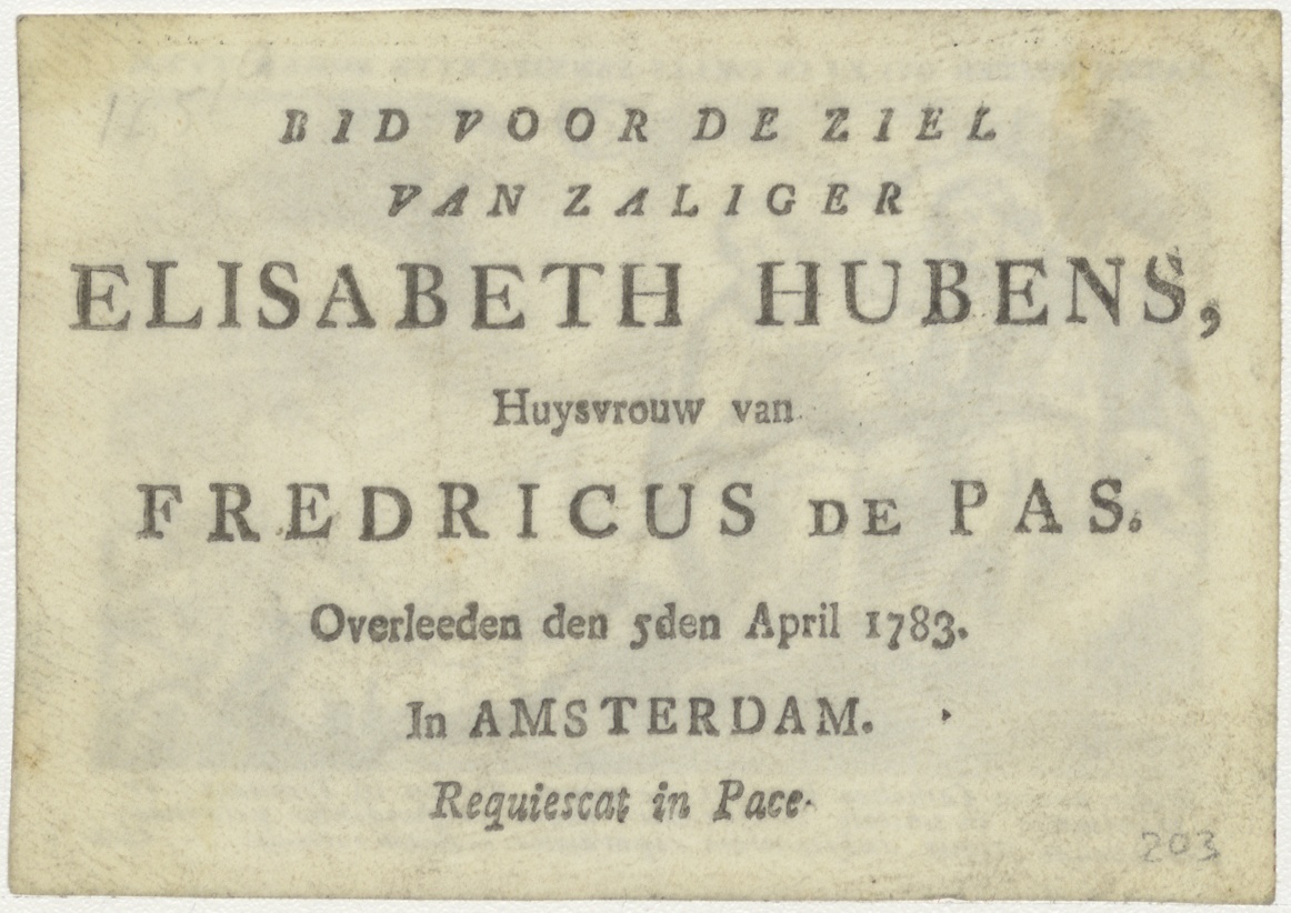 Onze vader die in de hemelen zijt, geheiligd worde uw naam, kz. Bid voor ziel Elisabeth Hubens (+1783);Amsterdam