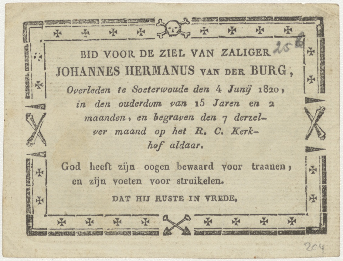 Laat toekomen uw rijk, kz. Bid voor ziel Johannes Hermanus van der Burg (+1820);Zoeterwoude