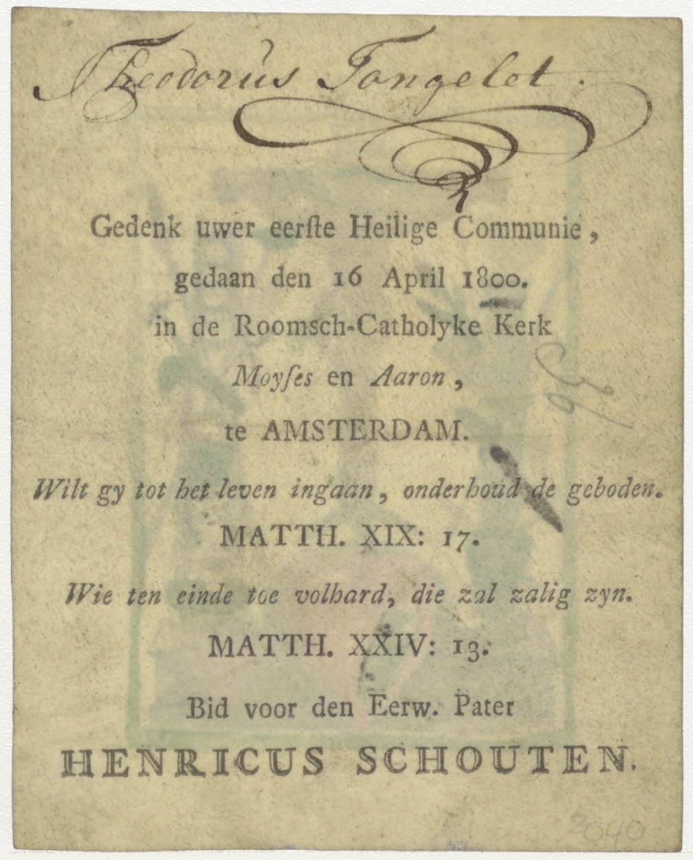 Christus aan het kruis met lijdenswerktuigen, ingekleurd, kz. H. Communie Tongelet;1802;Amsterdam;Mozes en Aaronkerk