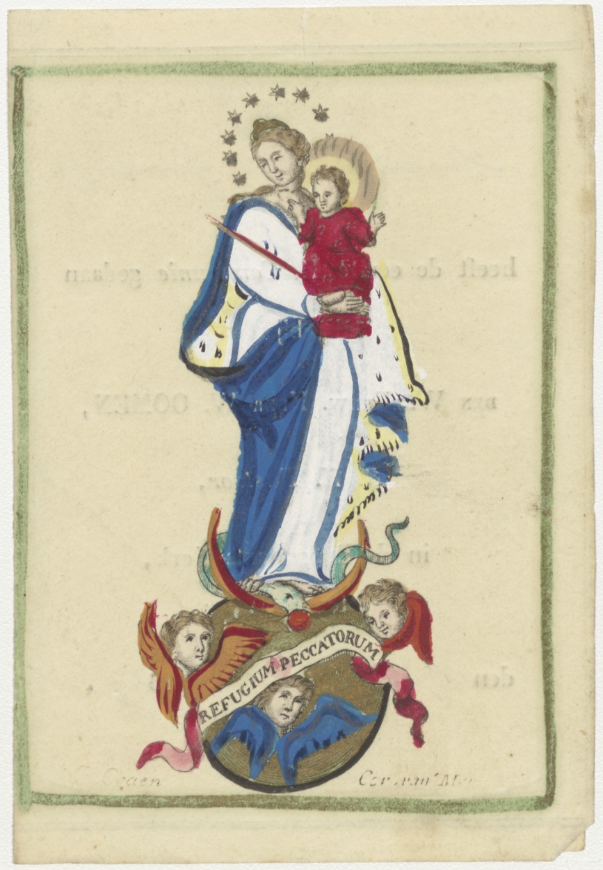 Maria staande op maan en wereldbol, toevlucht der zondaren, ingekleurd