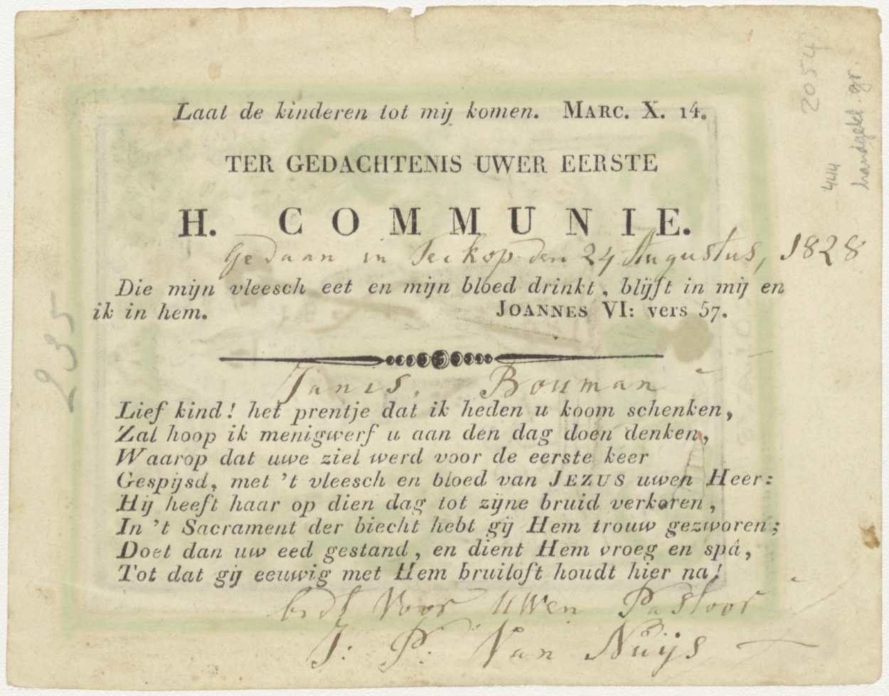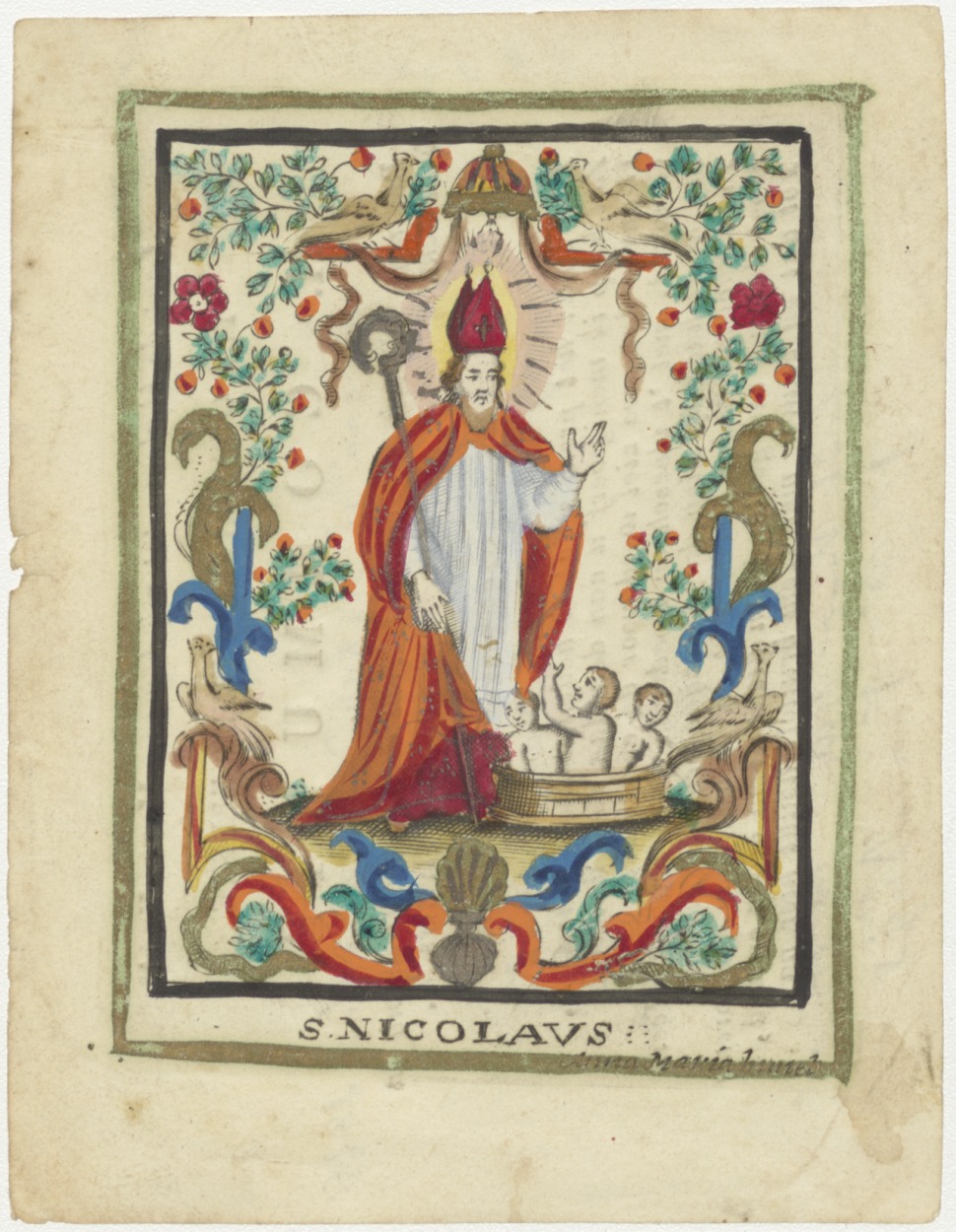 H. Nicolaas van Myra met drie kinderen in ton, ingekleurd, kz. H. Communie Bouman;1828;Teskop