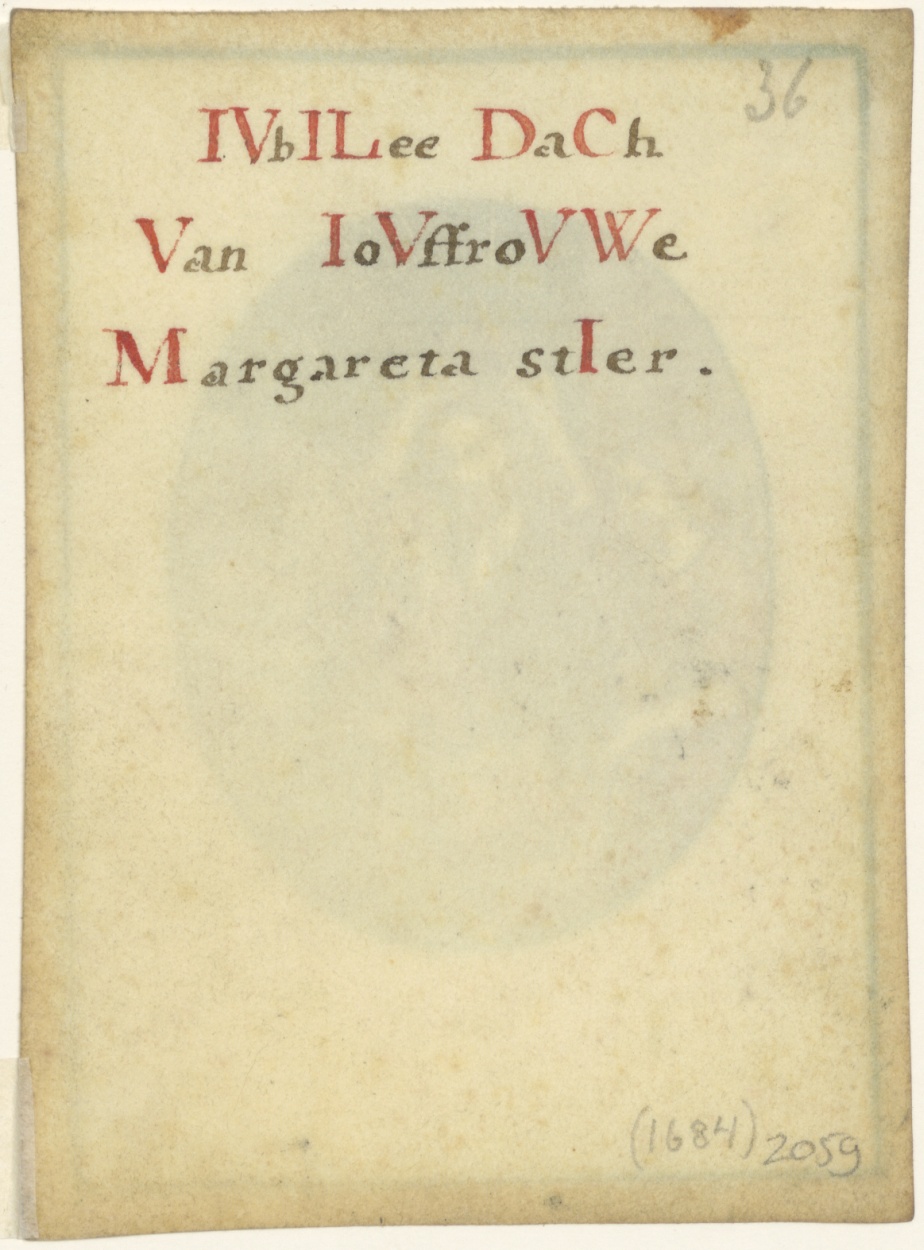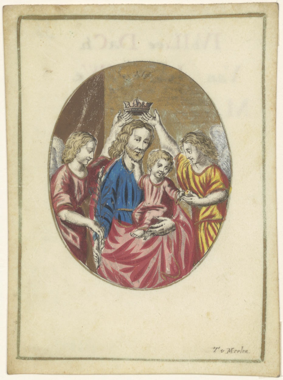Kroning van de H. Jozef, ingekleurd, kz. tijdvers: IVbILee DaCh Van IoVffroVWe Margareta stIer. (1684)