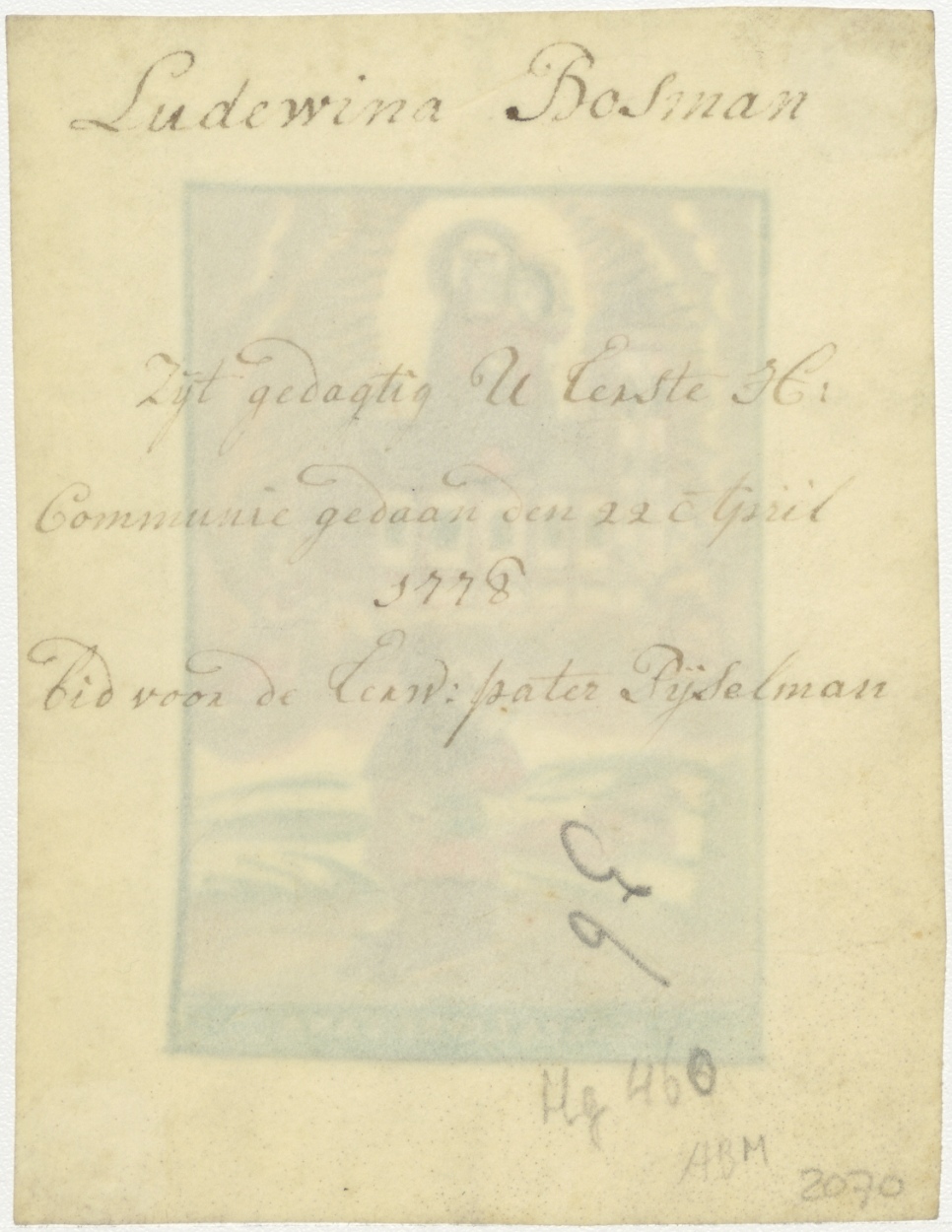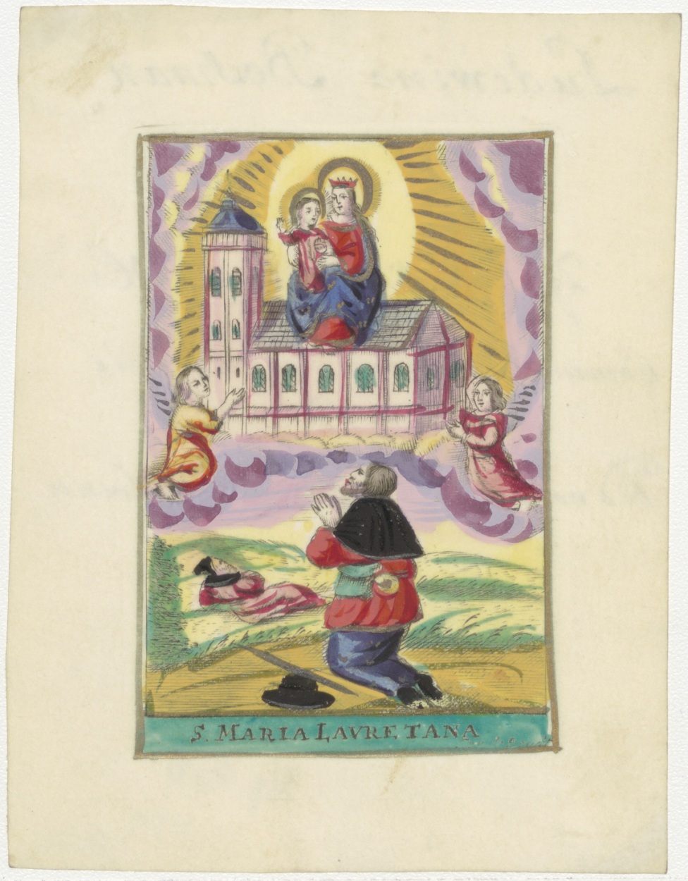 H. Maria Lauretana, met pelgrim biddend voor Maria gezeten op een kerk die door engelen gedragen wordt, ingekleurd, kz. H. Communie Bosman;1778