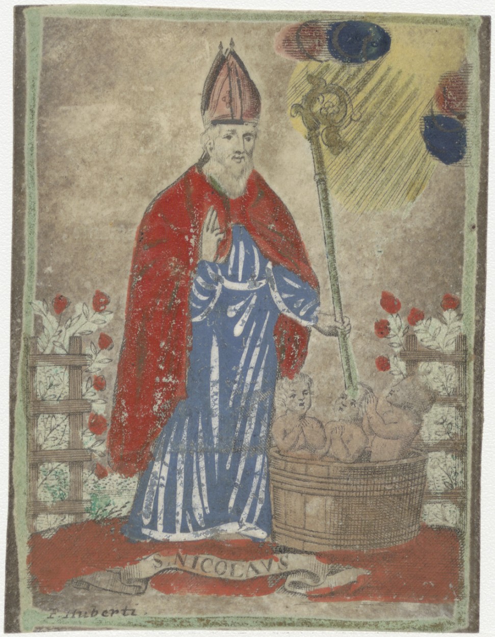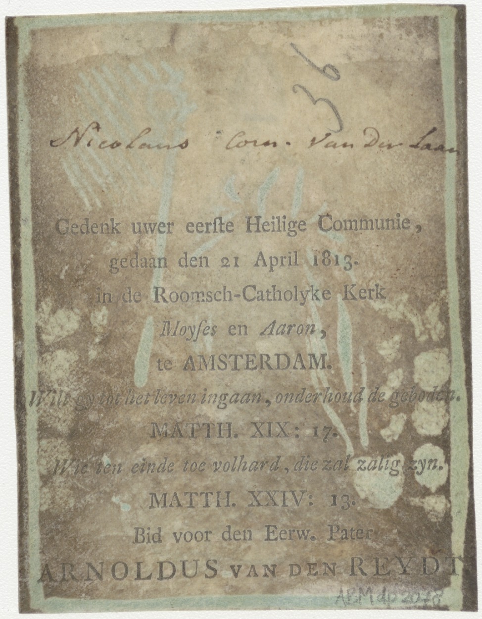 H. Nicolaas van Myra, ingekleurd, kz. H. Communie Van der Laan;1813;Mozes en Aaronkerk;Amsterdam