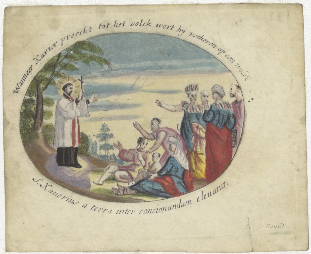 Prediking van de H. Franciscus Xaverius, ingekleurd, kz. Bid voor ziel Wilhelmus ... Hendrikus Christefore(?) ... 28 julij 182...(?)