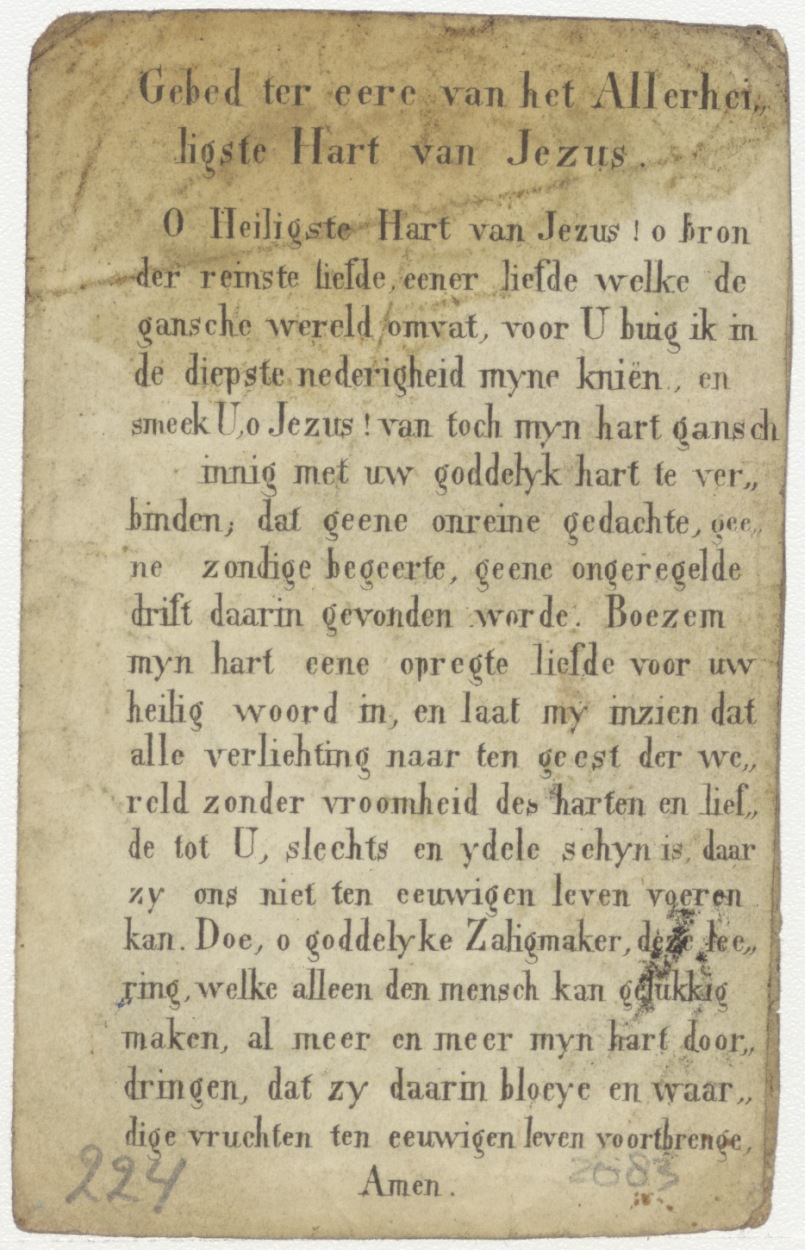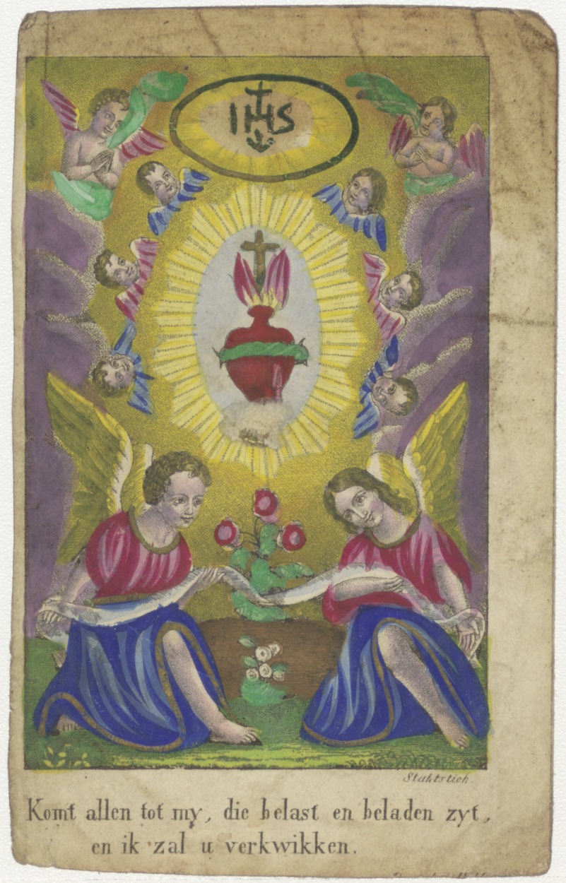 H. Hart van engelen omgeven, IHS monogram, ingekleurd, kz. Gebed ter ere van het Allerheilig Hart van Jezus;etc.